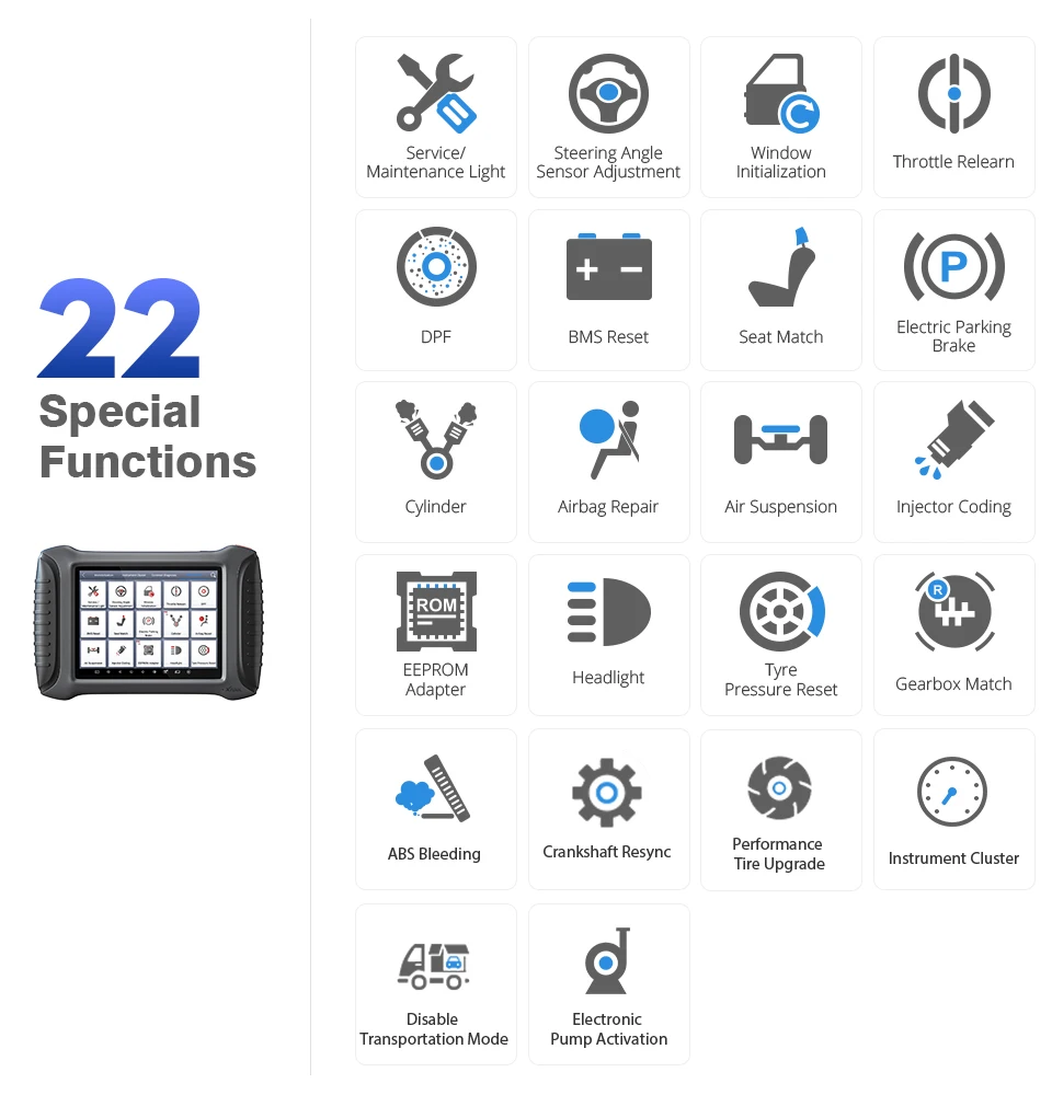 X100 PAD3 SE-это профессиональный программатор для ключей, который не только предоставляет клиентам программирование ключей, но и предоставляет расширенные специальные функции. X100 PAD3 SE может выполнять: Программирование ключей, сброс света масла, сброс освещения ремня синхронизации, сброс сигнального света давления в шинах, сброс EPB, сброс дроссельной заслонки, Сброс DPF, сброс батареи, Калибровка угла поворота руля и OBD-II диагностики двигателя и т. д. Xtool X100 PAD3 SE-идеальное решение для мастерских и техников, которые требуют профессиональной диагностики автомобиля.