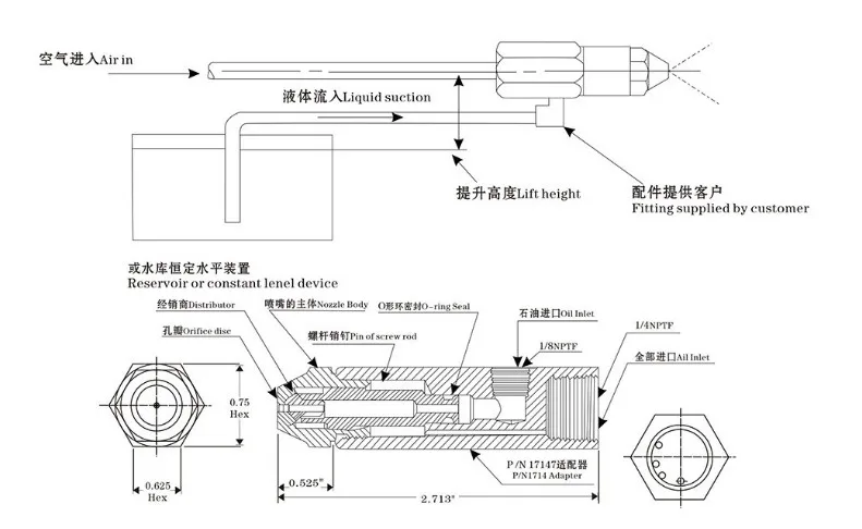 Информация о продукте: Общая длина: 68 мм Воздухозаборник: 1/4 ", пожалуйста, вставьте шланг с Φ8 мм или 6 мм Вход газа/масла: 1/8 ", пожалуйста, вставьте шланг с Φ8мм или 6 мм Диаметр отверстия: 0,5 мм 0,8 мм 1,0 мм 1,5 мм 2,0 мм 2,5 мм 3,0 мм 3,5 мм 4,0 мм Обзор продукта: Латунный сифон Воздушный Распылитель топливной горелки сопло низкого давления может распылить распылитель лучшего при низком давлении распылитель воздуха. Широко используется в дизельном, тяжелом масле, отработанном масле, животном и растительном маслах, топливной горелке на спиртовой основе, а также для керосина, распыления масла. Характеристики продукта: Использование сжатого воздуха для завивки внутри трубок и смешивания удара распыленных капель. Может производить крошечные микрочастицы размером с частицы тумана при низком давлении и условиях низкого объема. Может управлять потоком воздуха и давлением для регулировки потока распыления, угла и размера гранулярности. Так как поток жидкости сопла большой, он имеет хороший эффект против засорения. В тяжелом масле, горелке отработанного масла, масле и другой вязкости применения жидкого распыления эффект очень хорош. Диапазон рабочего давления 0-10/кг/см2, различная пропускная способность требует разного фильтра экрана Пропускная способность диапазон 1,5-1,7 л/ч, нуждается в 45um экрана фильтра для масла Диапазон емкости потока составляет 1,89-3,78 л/ч, нужен экран масляного фильтра 75um Диапазон пропускной способности составляет 4,76-5,10 л/ч, нужен экран масляного фильтра 125um Диапазон емкости потока составляет 5,68-41,64 л/ч, нужен масляный фильтр 140um Пропускная способность более 45.42л/ч, нет необходимости в экране масляного фильтра Рабочее давление 3 бар: 0,5 мм диаметр, жидкой воды поток 4 л/ч; 0,8 мм диаметр, жидкой воды расхода составляет 6 л/ч; 1,0 мм диаметр, жидкой воды расхода составляет 8 л/ч; 1,5 мм диаметр, жидкой воды поток 11L/ч; 2,0 мм диаметр, жидкой воды поток 14L/ч; 2,5 мм диаметр, жидкой воды поток 17L/ч; 3,0 мм диаметр, жидкой воды поток 20L/ч; 3,5 мм диаметр, жидкой воды поток 23L/ч; 4,0 мм диаметр, жидкой воды поток 26L/ч; Высота сифона составляет 30 см, а угол распыления-15-45 градусов. Пожалуйста, обратите внимание, что приведенные выше данные основаны на воде для справки Тест: Обычно рабочее давление составляет 3 бар, для версии 1,00 мм жидкие отходы-10л/ч. Для версии 2,0 мм жидкие отходы-19л/ч. Для версии 3,0 мм жидкие отходы составляют 28Л/ч. Допустимая мощность составляет 10%. Высота сифона составляет 30 см, а угол распыления-45 градусов. Пожалуйста, обратите внимание, что приведенные выше данные основаны на воде для справки, если вы используете другую жидкость, вы можете рассчитать ее пропорцией плотности. Установка: Воздушный компрессор должен быть способен обеспечить не менее 10% больше воздуха, чем указанные значения. Все соединения с топливом и авиакомпанией должны быть плотными. Любые утечки, особенно в топливной линии, окажут отрицательное влияние на характеристики подъема. Сопло будет течь в горизонтальном или вертикальном положении. Расстояние Подъема Вертикального сопла измеряется от уровня жидкости до конца (лицевой стороны) сопла. Расстояние подъема для горизонтального крепления отображается на монтажном чертеже. Если применение сгорания не позволяет использовать устройство постоянного уровня, отличные характеристики распыления могут быть получены с помощью 
