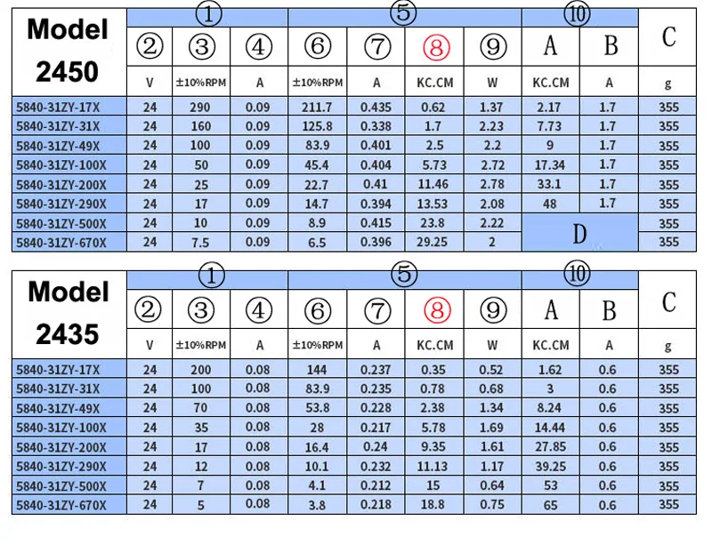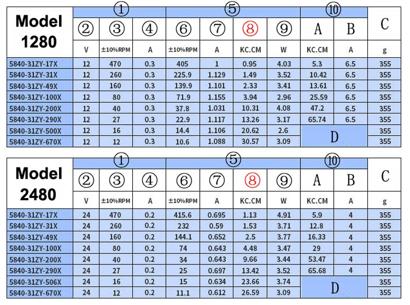 Искреннее напоминание Нагрузка вашего проекта не должна превышать крутящий момент рабочей нагрузки двигателя, в противном случае срок службы двигателя будет уменьшен или двигатель горит Параметры в таблице ниже приведены параметры для подключения двигателя Номинальное напряжение: DC 12v/24v Если двигатель подключен к входному напряжению без номинального напряжения, все параметры двигателя изменятся. ① Когда двигатель не имеет нагрузки ② Номинальное напряжение ③ Скорость без нагрузки ④ Ток без нагрузки ⑤ Когда рабочая нагрузка двигателя ⑥ Число оборотов холостого хода ⑦ Световой индикатор Ток холостого хода Torque крутящий момент нагрузки (мы рекомендуем, чтобы нагрузка вашего проекта не превышала этот крутящий момент) ⑨ Выход мощность ⑩ В тех случаях, когда двигатель стойло A: крутящий момент с блокированным ротором B: ток с блокированным ротором C: вес нетто двигателя D: запрещать стойло