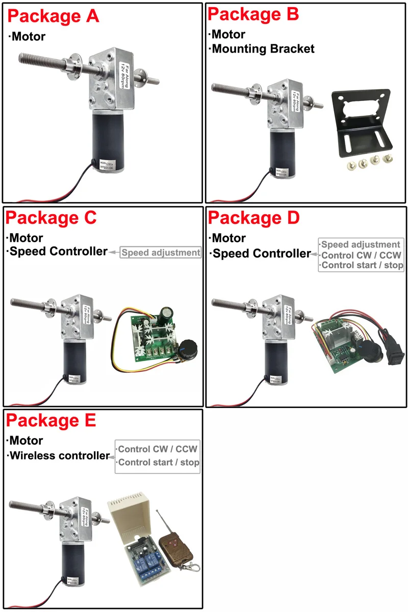 Во-первых, вам нужно выбрать напряжение и Скорость без нагрузки двигателя, а затем выбрать опции для пакетов от А до Е. Посылка A: Вы получите мотор Посылка B: вы получите мотор и монтажный кронштейн Посылка C: вы получите мотор и регулятор скорости; Этот контроллер может регулировать скорость двигателя; Например, скорость двигателя, который вы выбираете 12 в 40 об/мин, вы можете регулировать скорость двигателя от 0 об/мин до 40 об/мин, но этот контроллер может регулировать только скорость двигателя Посылка D: вы получите мотор и регулятор скорости; Этот контроллер может не только регулировать скорость двигателя, но и управлять направлением вращения двигателя, а также управлять запуском и остановкой двигателя. Посылка E: вы получите мотор и беспроводной контроллер; Беспроводной контроллер может управлять направлением вращения двигателя, запускать или останавливать и может удаленно управлять двигателем с помощью пульта дистанционного управления, но не рекомендуется находиться слишком далеко. Но этот контроллер не может контролировать скорость двигателя.