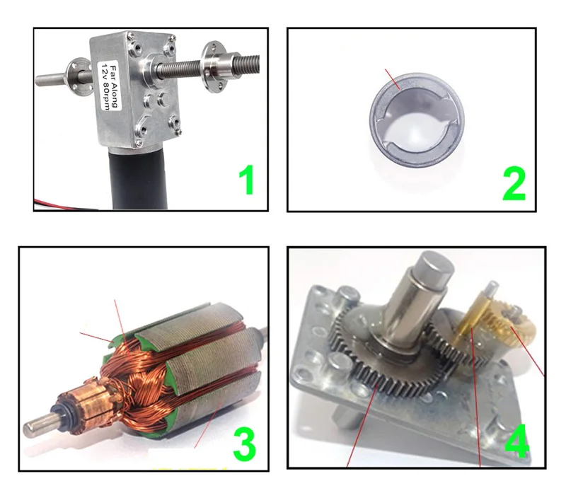 1. Двойные резьбовые валы M8 с фланцем 2. Высококачественный магнит, полный и не изменяет магнитное поле, так что производительность двигателя лучше, и ротор не застревает 3. Катушка из чистой меди, высокая термостойкость, супер проводящая. 4. Все металлические шестерни