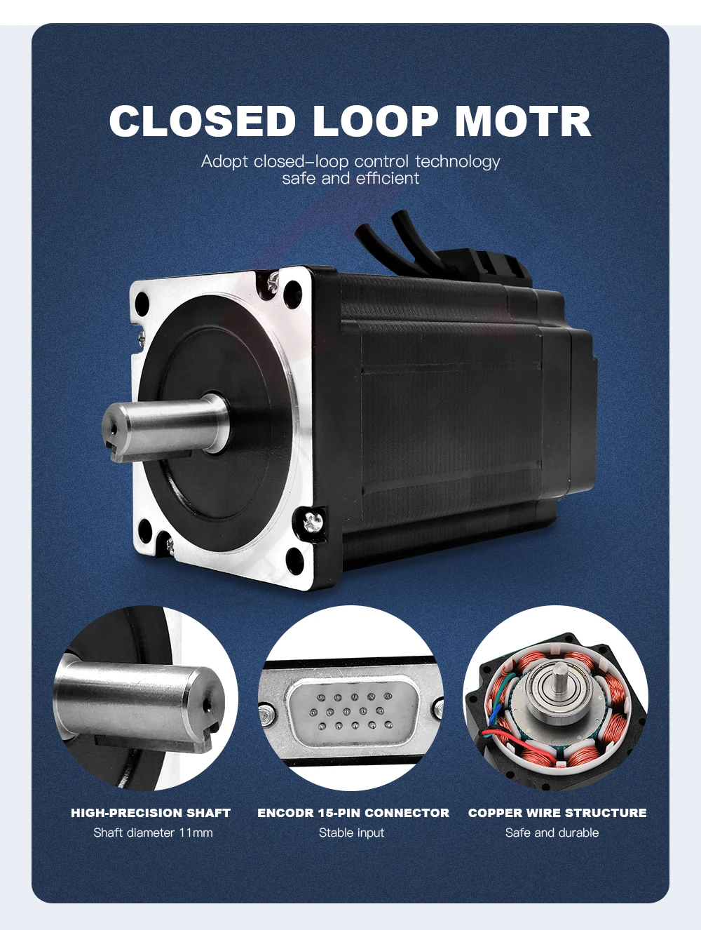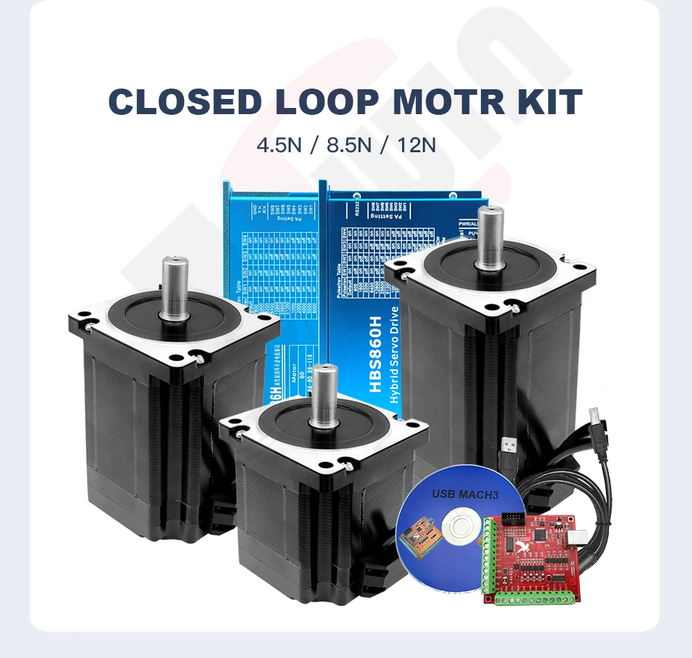 3 комплекта:3 шт. двигатель с замкнутым контуром NEMA343 шт. 3 м кодовая строкаПривод HBS860H или HBS86H, 3 шт.Блок питания 400 Вт, 3 шт.4-осевая плата управления MACH3, 1 шт.
