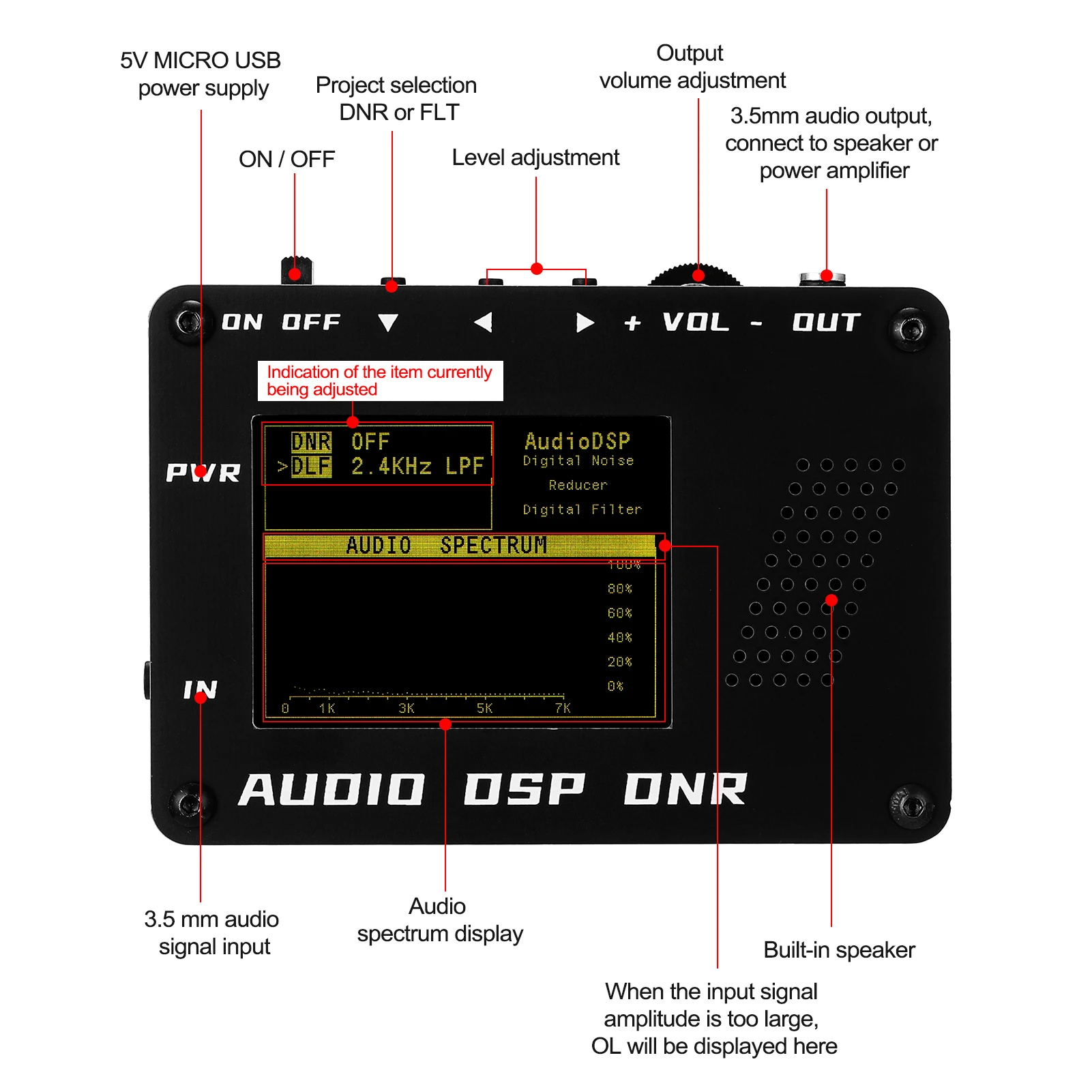 Этот звуковой шумоподавитель DSP с помощью этого инструмента вы можете использовать его для обработки аудиосигнала, а затем реализовать Цифровое шумоподавление и цифровую фильтрацию. Подходит для использования радиоприемников. Приходите и попробуйте, это не подведет вас.