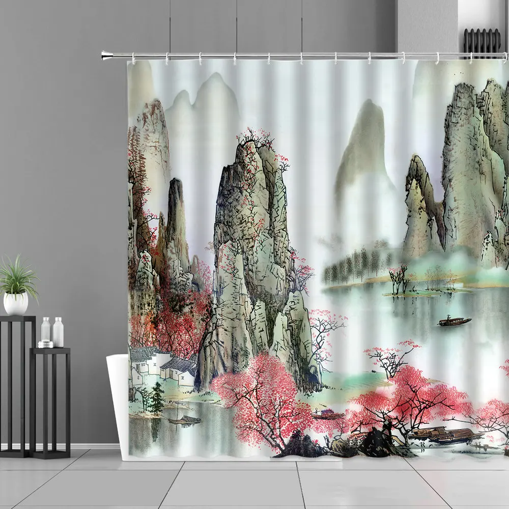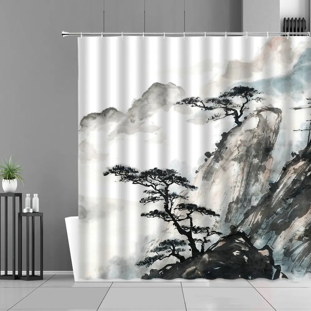 Картина тушью бамбуковые листья птица занавеска для душа s горная вода растение пейзаж Водонепроницаемый Ванная занавеска китайский домашний декор