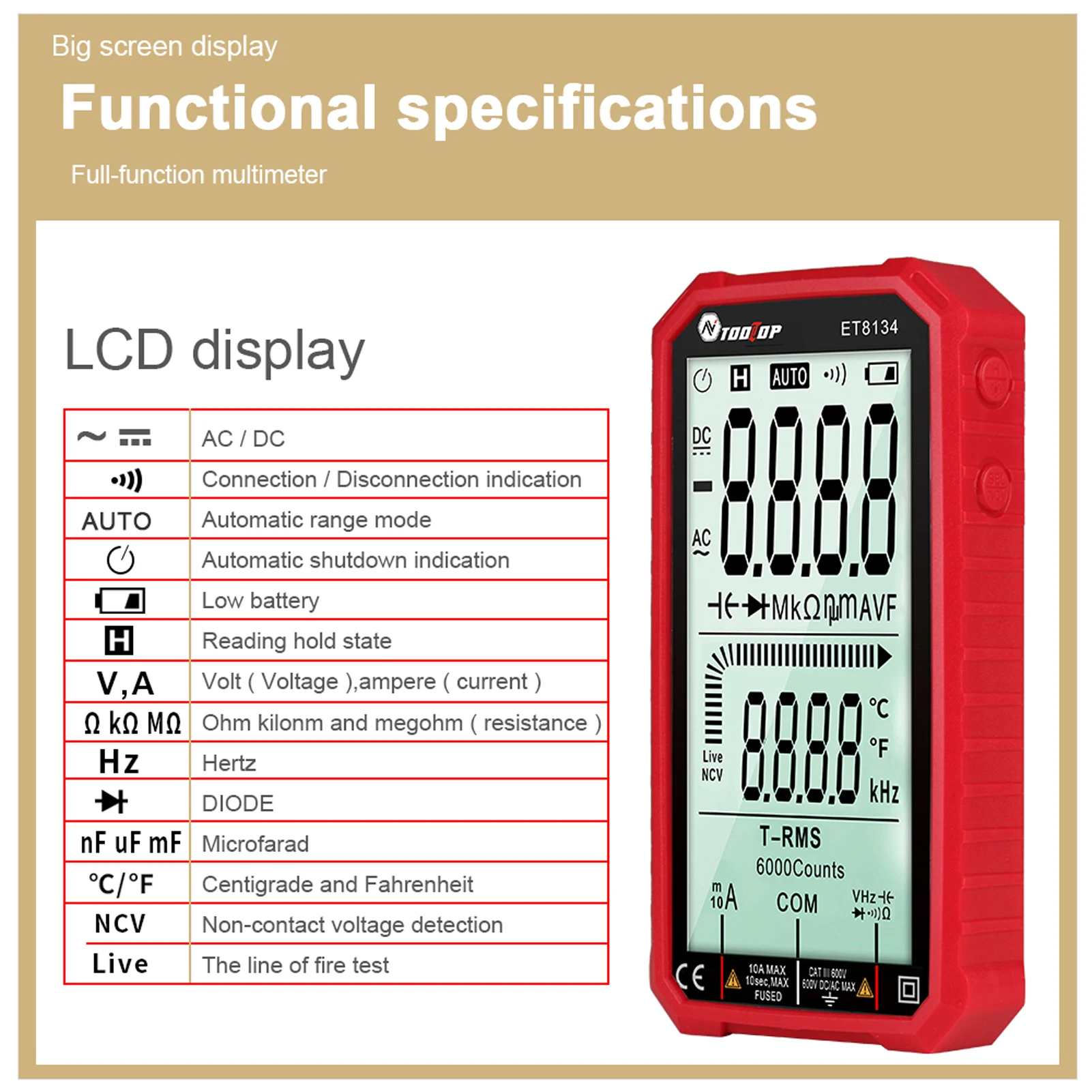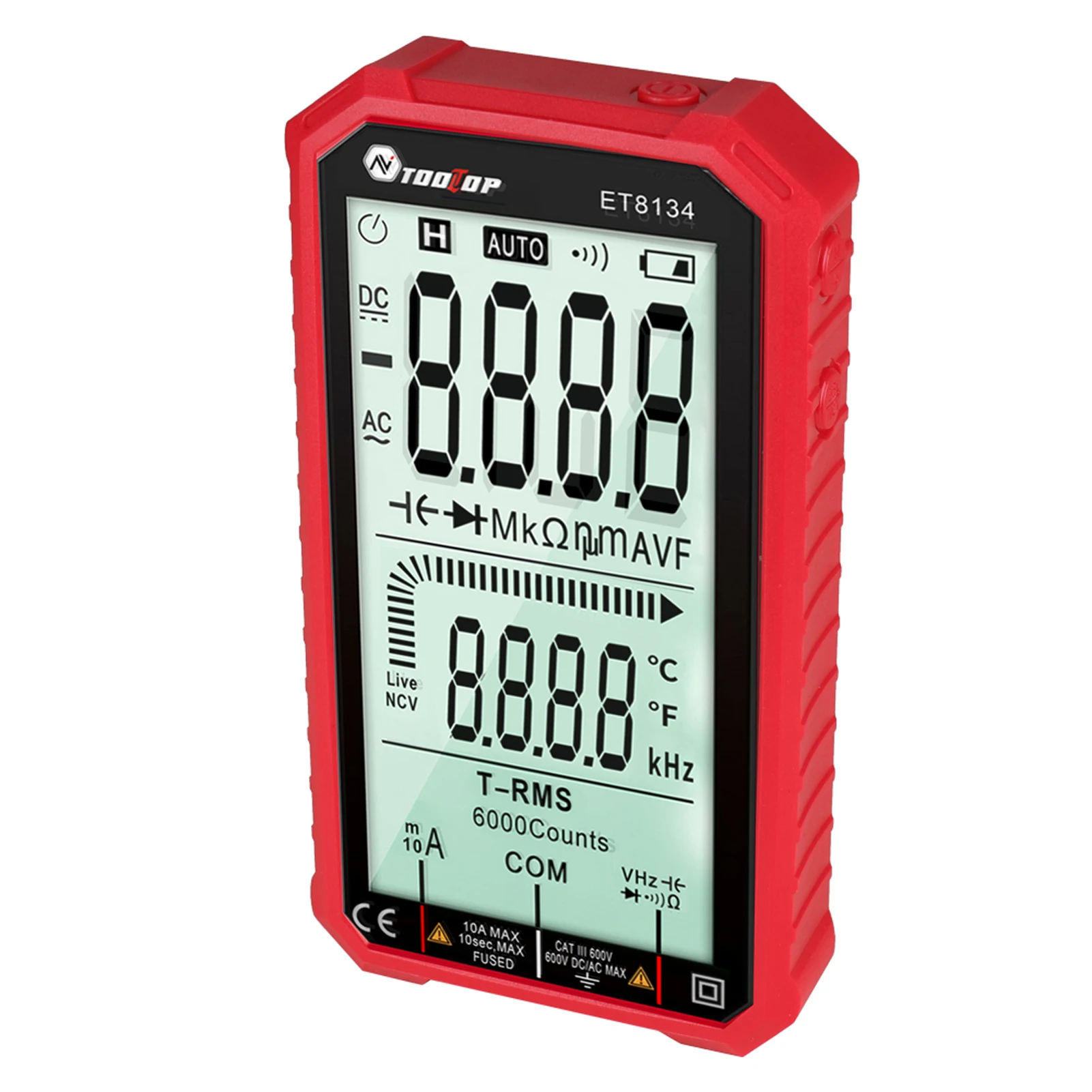 Многофункциональный: он используется для измерения напряжения переменного и прямого тока и тока, измерения емкости и сопротивления, бесконтактного напряжения и измерения температуры NCV, измерения диодов и непрерывности, распознавания проводов firewire и null.