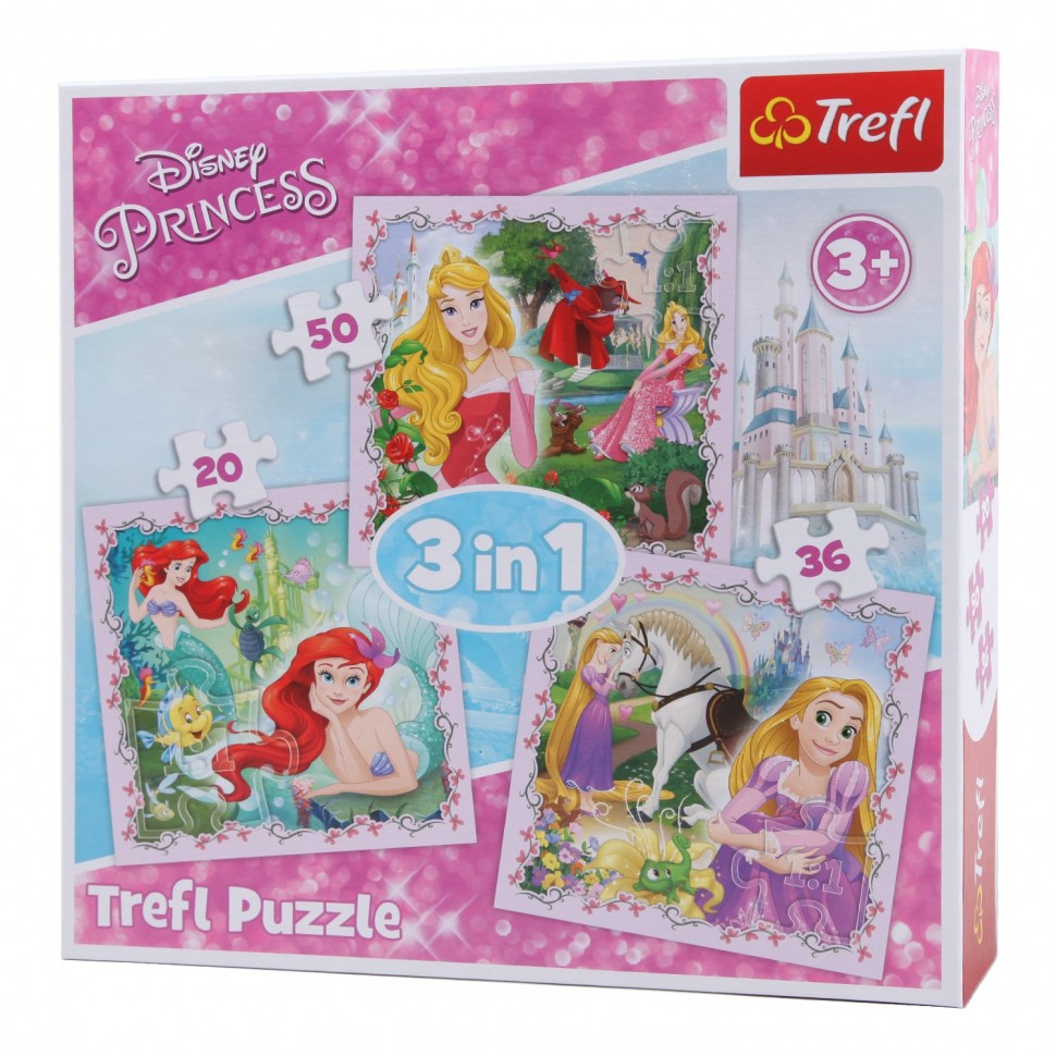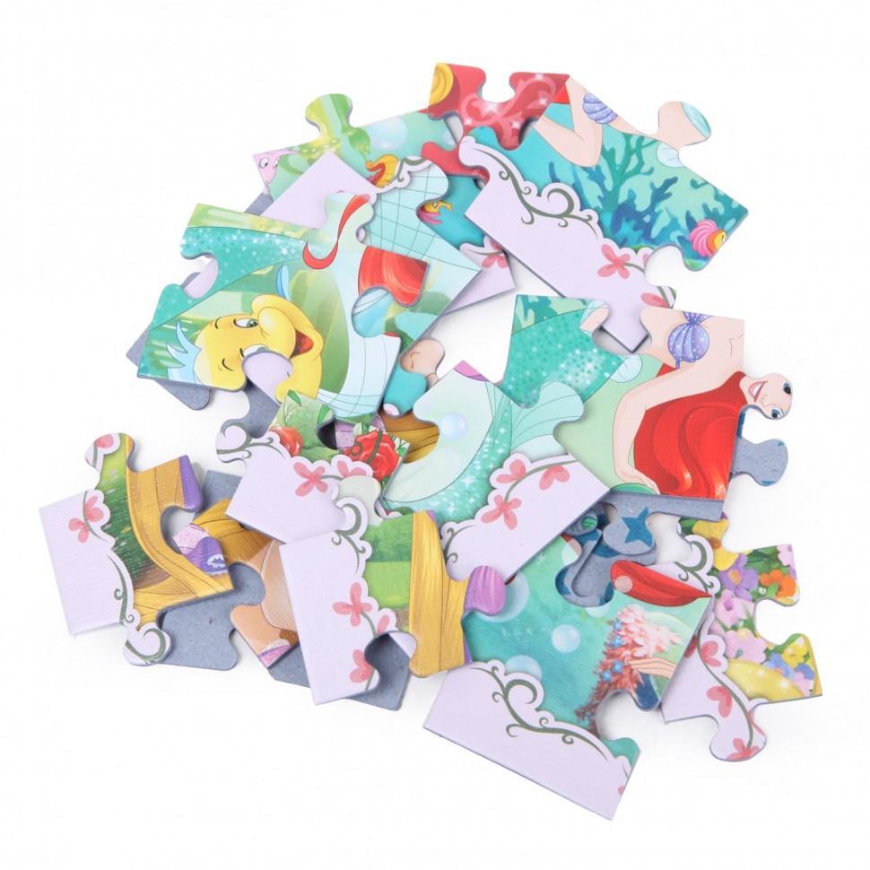 В набор входят три пазла с разным количеством элементов: 20, 36 и 50 шт.На картинках изображены принцессы Рапунцель, Аврора (Спящая красавица) и Ариэль.Пазл подойдет для детей от 3 лет.