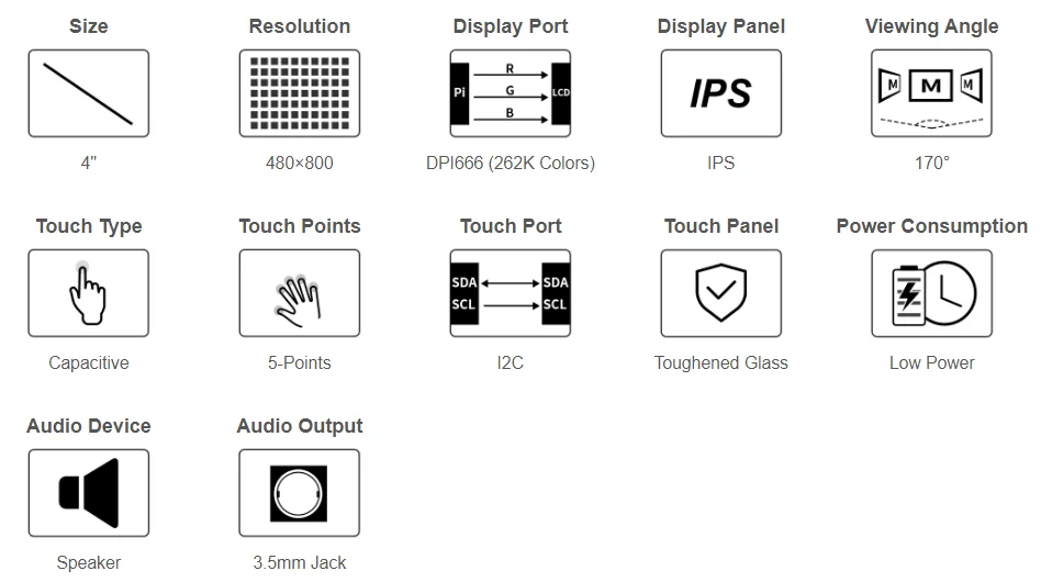 Raspberry Pi На основе Raspberry Pi 40PIN GPIO header Управляемый интерфейсом Raspberry Pi DPI666, частота обновления до 60 Гц 5-точек сенсорное управление через Raspberry Pi I2C интерфейс Поддерживает такие системы, как Raspbian, Kali... Поддерживает будущую версию, которая обратно совместима Ориентация дисплея по умолчанию, разрешение 480 × 800 (H×V). Измените конфигурацию программного обеспечения для отображения ландшафта. Нет аудиовыхода при работе с Pi 4B на данный момент.