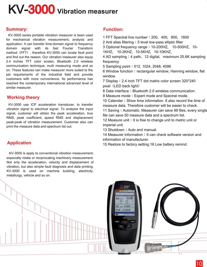 Виброметр используется для измерения механической вибрации, анализа и применения. Он может передавать сигнал тайм-домена на Частотный сигнал домена с его быстрым методом преобразования Фурье (FFT), поэтому KV-3000 может найти точку ошибки и узнать причину. Наш Вибрационный дозатор также снабдить 2,4 дюймов TFT цветной экран, Bluetooth 2,0 Беспроводная связь, мульти режим измерения и так далее. Эти функции могут сделать измеритель более подходящим для требований работы в промышленной области и предоставить клиентам больше удобства. Его производительность достигла современного международного передового уровня аналогичного измерителя. Это относится к обычным измерениям вибрации, особенно для измерения вращения или возвратно-поступательного оборудования. Не только ускорение, скорость и смещение вибрации, но и простая Диагностика неисправностей и печать данных. Он используется на машиностроении, электричестве, металлургии, автомобиле и так далее.
