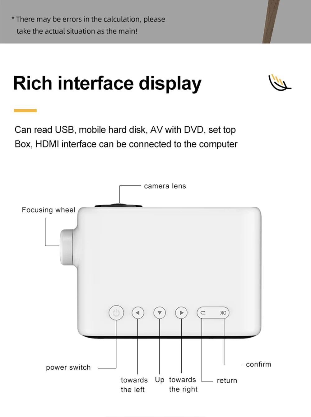 Посылка: посылка содержит: Хост проектора YG280 + адаптер питания + пульт дистанционного управления + линия AV «Три в одном» + руководство на английском языке