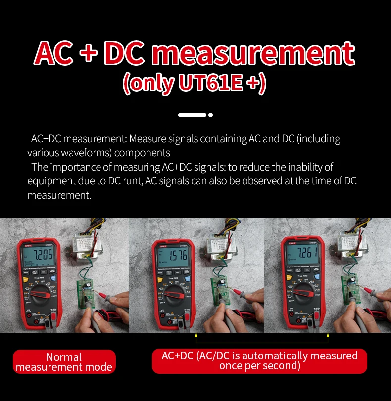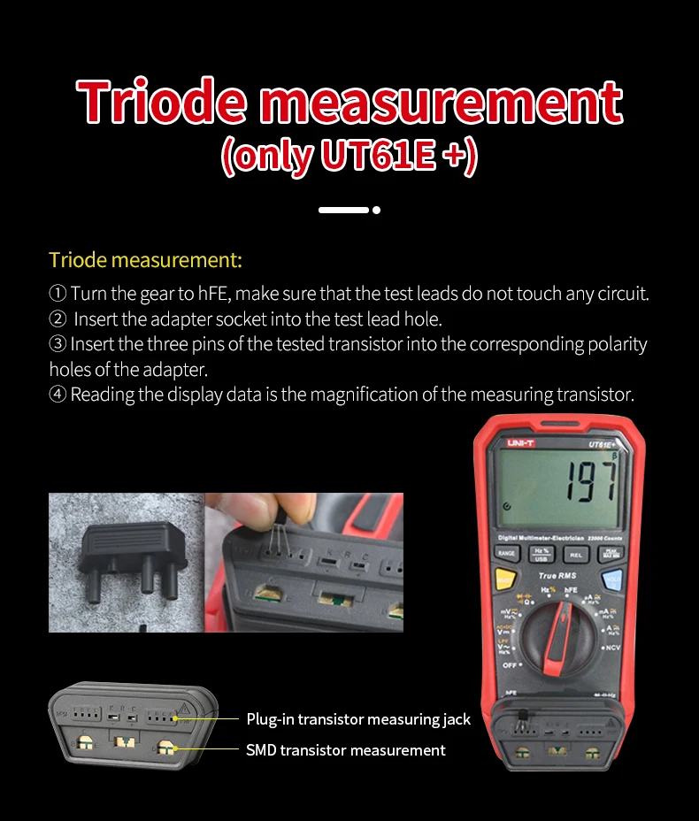 Серия UT61 +-это надежные цифровые мультиметры RMS с отображением 6000 (UT61B +/D +) и 22000 (UT61E +). Он может измерять до 1000 В переменного/постоянного тока.