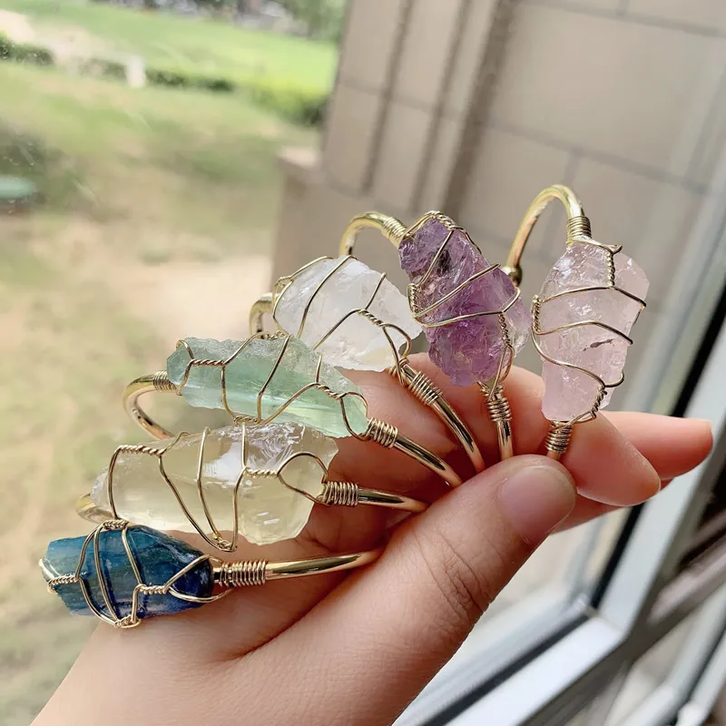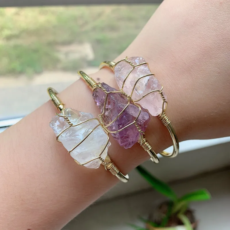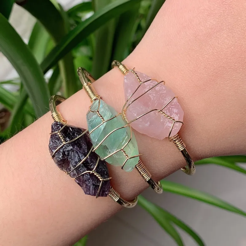 Браслет с природными камнями проволочная обернутая манжета неправильный рок синий кварц аметисты флюорит розовый кристалл браслеты для женщин Reiki Исцеление