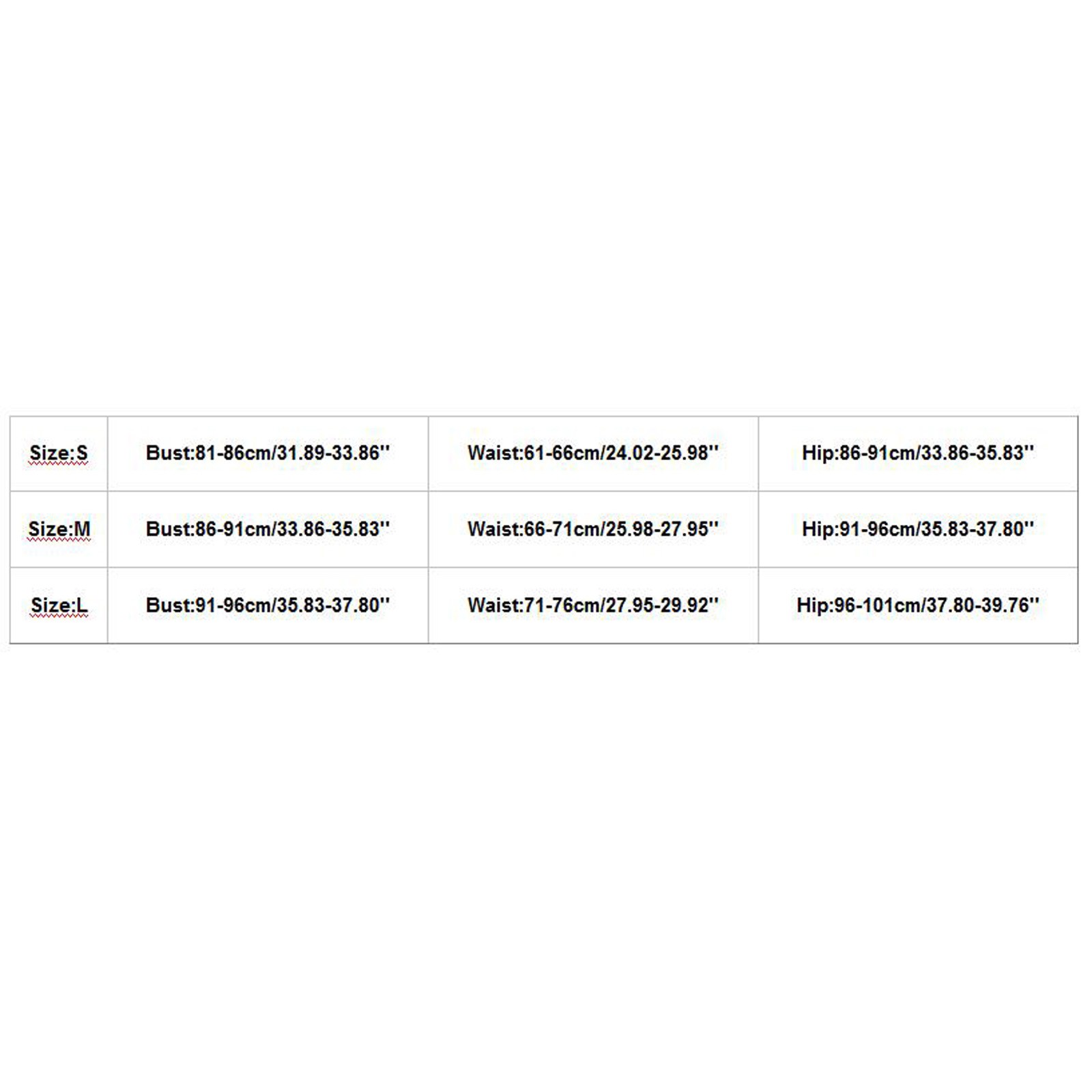 Размеры Бюст Талия Бедра S 81-86 см/31,89-33,86'' 61-66 см/24,02-25,98'' 86-91 см/33,86-35,83'' М 86-91 см/33,86-35,83'' 66-71 см/25,98-27,95 дюйма 91-96 см/35,83-37,80'' L 91-96 см/35,83-37,80'' 71-76 см/27,95-29,92'' 96-101 см/37,80-39,76''