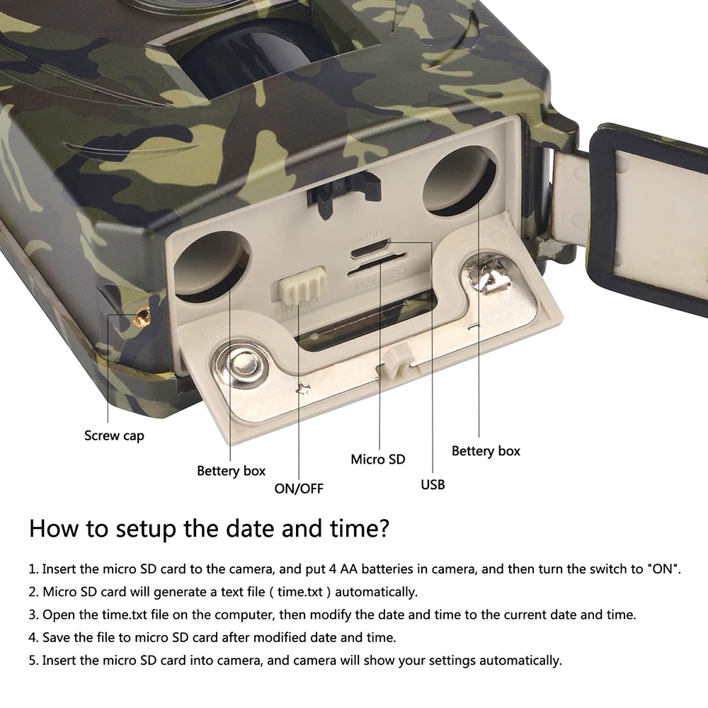 2. Перед началом работы камеры Установите 2 аккумулятора 18650 для источника питания и tf-карту для хранения изображений и видео, снятых в будущем. (Аккумуляторы и tf-карты здесь не включены)
