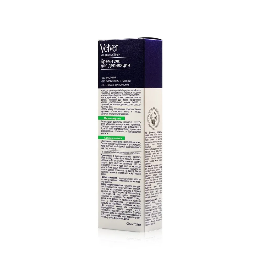 Manufactuer Velvet Country Russia Softening Softening effect Process For depilation Tipconsistency Creme Application Scope Intimate zones Gender accessories For women Application Area For body Packing & LPAR; mlgg & rpar; 125 ml Article 3122184Appearance Goods