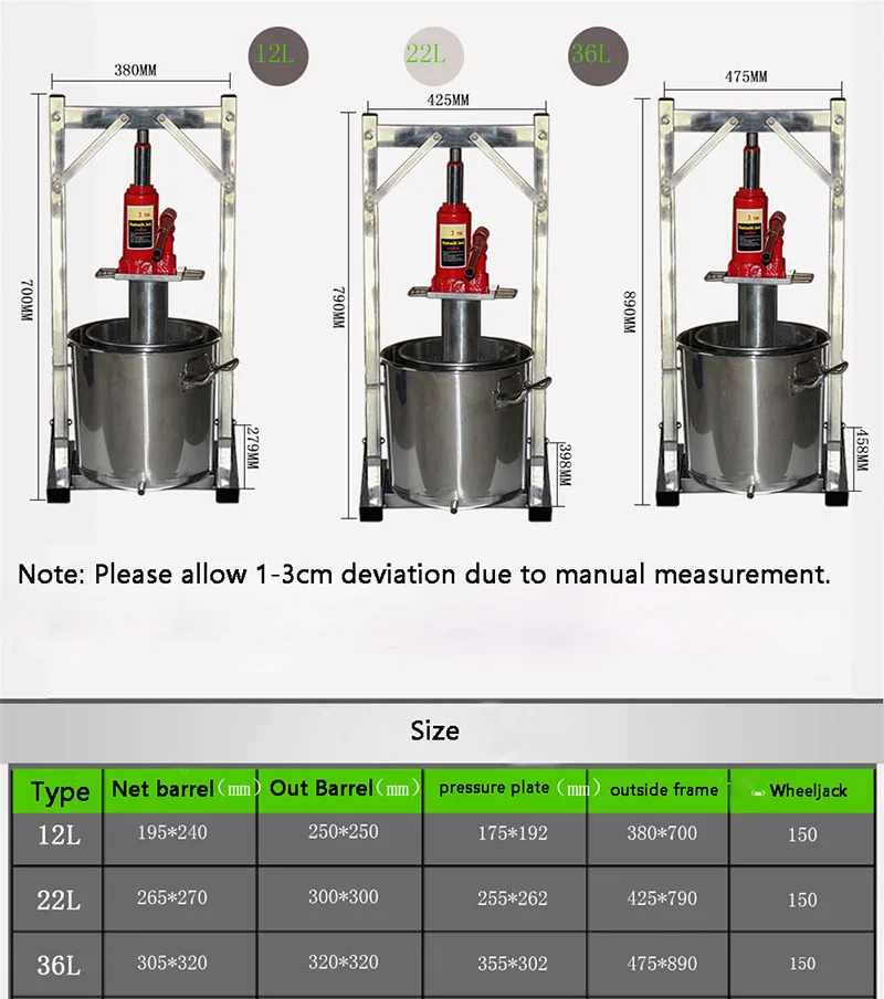 Модель: 12L Количество цилиндра: 195*240 мм Внешний цилиндр: 250*250 мм Давление: 175*192 мм Рамка: 380*700 мм Колесный домкрат: 150 Вес: 14 кг Размер: 279*380*700 мм Модель: 22L Количество цилиндра: 265*270 мм Внешний цилиндр: 300*300 мм Давление: 255*262 мм Рамка: 425*790 мм Колесный домкрат: 150 Вес: 20 кг Размер: 398*425*790 мм Модель: 36L Количество цилиндра: 305*320 мм Внешний цилиндр: 320*320 мм Давление: 355*302 мм Рамка: 475*890 мм Колесный домкрат: 150 Вес: 26 кг Размер: 458*475*890 мм