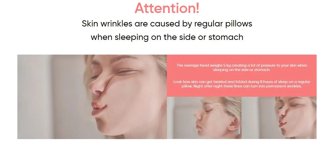 Во время сна с обычной подушкой в среднем 5 кг давления, нанесенного на вашу кожу во время сна, вызывает углубление линий и морщин сна.
