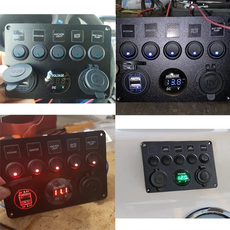 Многофункциональная Панель; Двойная розетка USB + Вольтметр + розетка 12V + 5 тумблеров 5 светодиодный тумблеров имеют защиту от перегрузки, перегрузки по току и короткого замыкания. Панель переключателей подходит для универсального автомобиля, лодки, грузовика