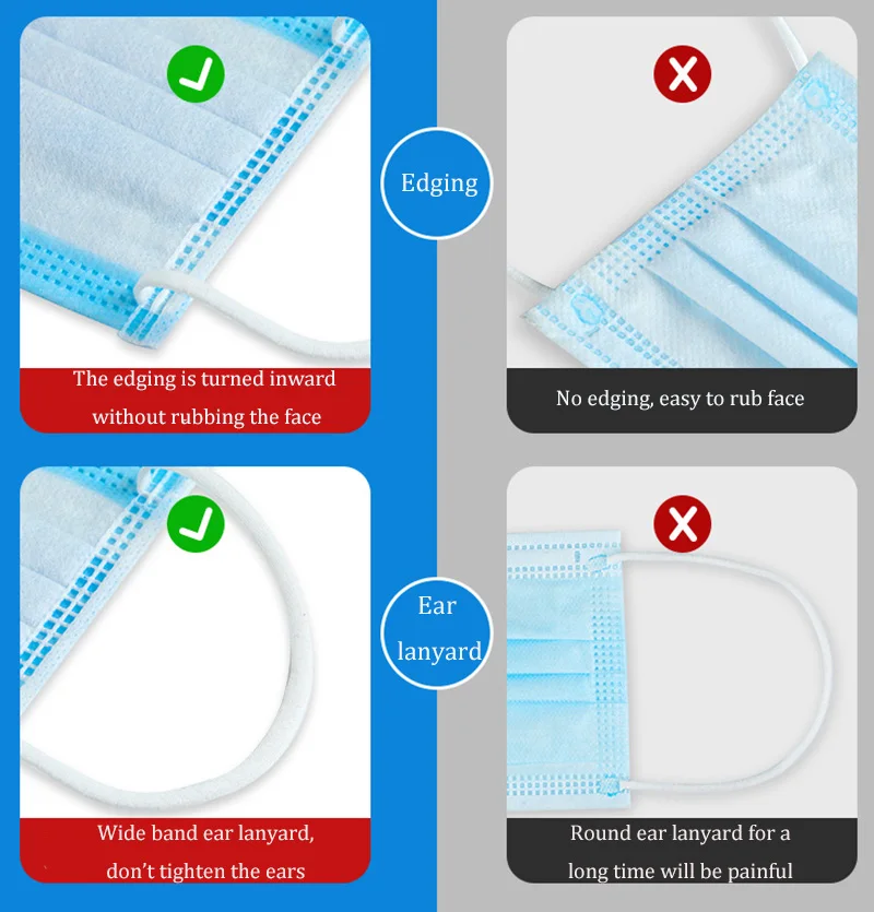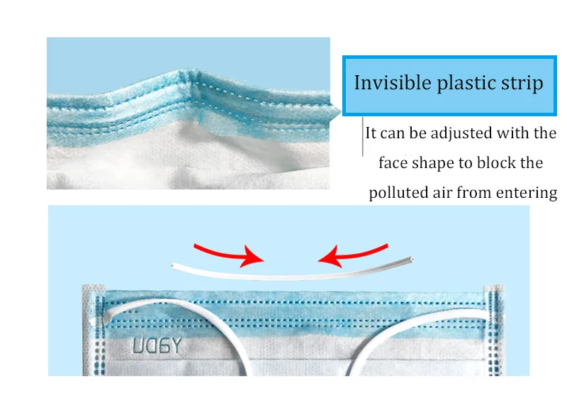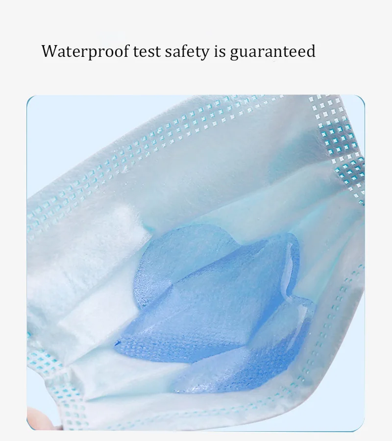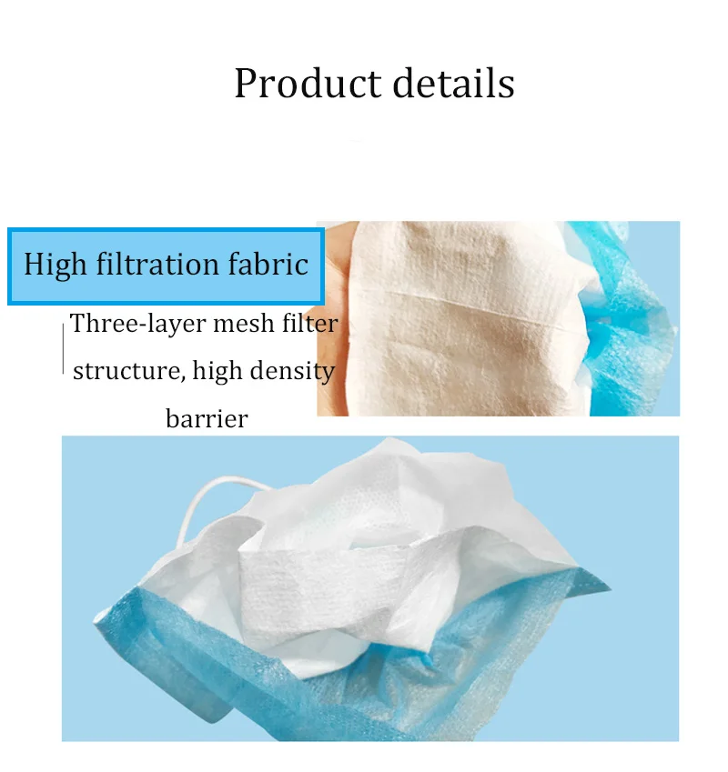 1. Три слоя защиты: нетканый наружный слой + медицинский мелтдутый слой для фильтра + Антибактериальный нетканый внутренний слой.