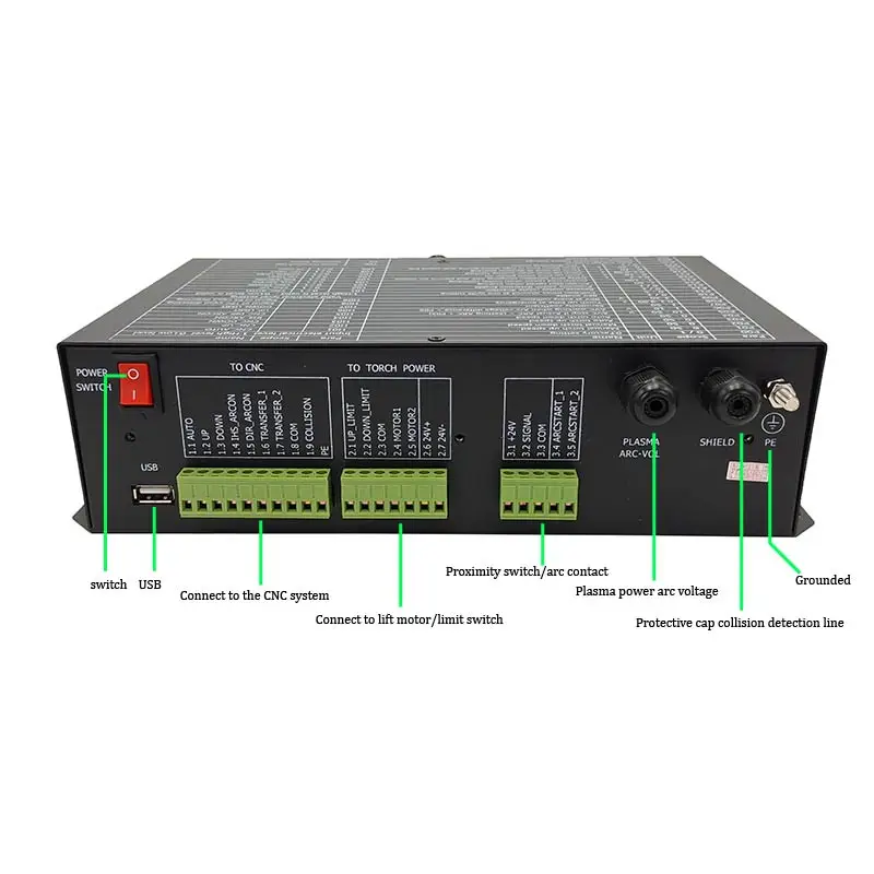 Особенности: Два первоначальных методы позиционирования 1. Позиционирование переключателя приближения 2. Защитный колпачок позиционирования Автоматическая защита температуры факел 1. После Удара пистолета, пистолет будет автоматически поднят 2. После завершения резки пистолет автоматически поднимается Дуги текущий контроль уровня напряжения Двойной дисплей давления дуги, удобный для пользователей, чтобы контролировать высоту в резке в реальном времени. Динамический перфорации Мгновенно пронзите и поднимите факел. Защитите факел от брызг травм. Автоматическое управление высотой напряжения дуги Во время резки высота стальной пластины автоматически отслеживается, и факел и стальная пластина всегда поддерживаются на фиксированной высоте для обеспечения качества резки. Несколько режимов работы 1. Автоматическая Работа 2. Руководство по эксплуатации Напряжение дуги интеллигентая (ый) Регулировка После нескольких столкновений заданное Напряжение дуги автоматически увеличивается Столкновения обратной связи Сразу после столкновения сигнал о столкновении возвращается в систему управления. Параметры продукта Рабочее напряжение: DC24 ± 10%, 60 Вт Подъемный двигатель: DC24V двигатель постоянного тока, 45 Вт Режим привода: PWM плавная регулировка скорости, h-мост MOS привод Рабочая температура: 0-50 ℃ Способ позиционирования: позиционирование защитного колпачка или позиционирование бесконтактного переключателя Диапазон напряжения дуги: 0V-600V Точность выборки: 0,2 в Точность управления: 0,5 В Частичное давление: 100: 1 Скорость подъема: 8000 мм/мин Чувствительность: регулируется по параметрам Защита: защита от перегрузки Защита от превышения температуры Защита от короткого замыкания Под защитой от перенапряжения Источник питания защита от обратного хода