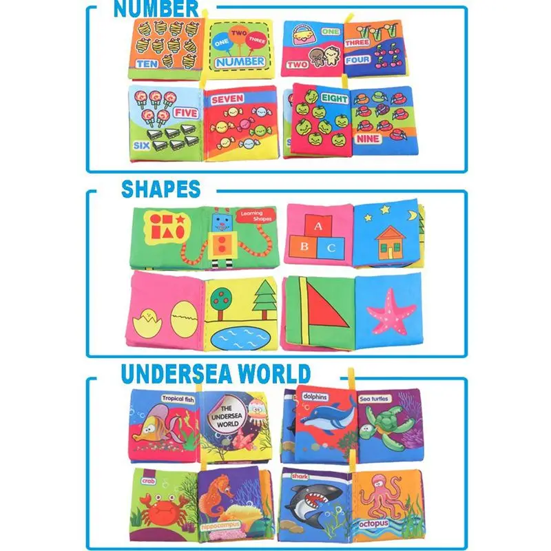 Посылка включает в себя: 9 Упаковок тканевых книг, они являются цифрами, животными, овощами и так далее.