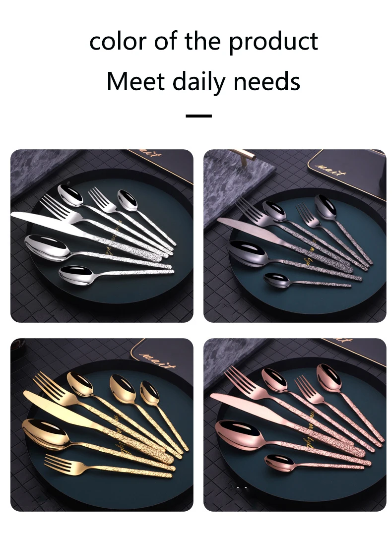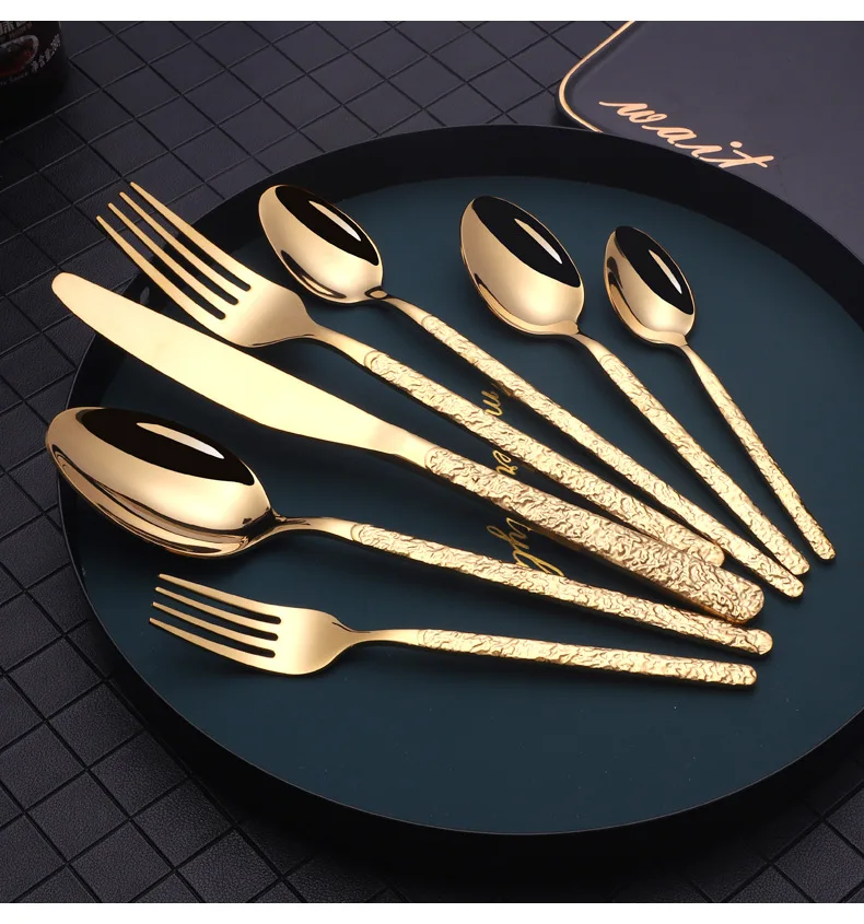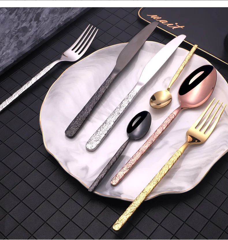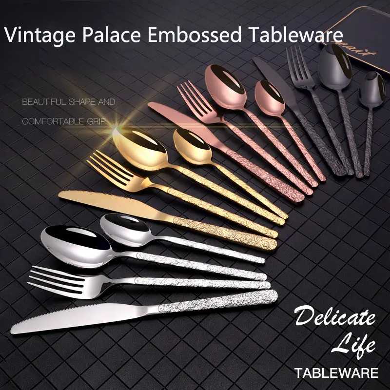 Креативная Дворцовая рельефная Западная Посуда для отеля Ретро столовые приборы из нержавеющей стали позолоченная Титановая посуда Набор ножей, вилок и ложек Материал: 201 нержавеющая сталь (главный Настольный нож 401) Цвет: Золотой/Серебряный/черный/розовое золото Размер: как показано Применимые подарочные мероприятия: свадьбы, дни рождения, праздники, новоселье, торговые ярмарки, рекламные акции, льготы для сотрудников, юбилейные праздники, бизнес-подарки, церемонии открытия, памятные церемонии, планирование общественных отношений