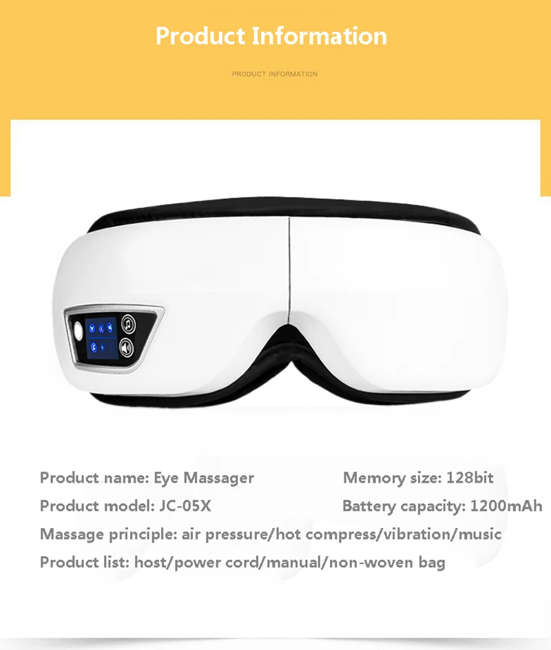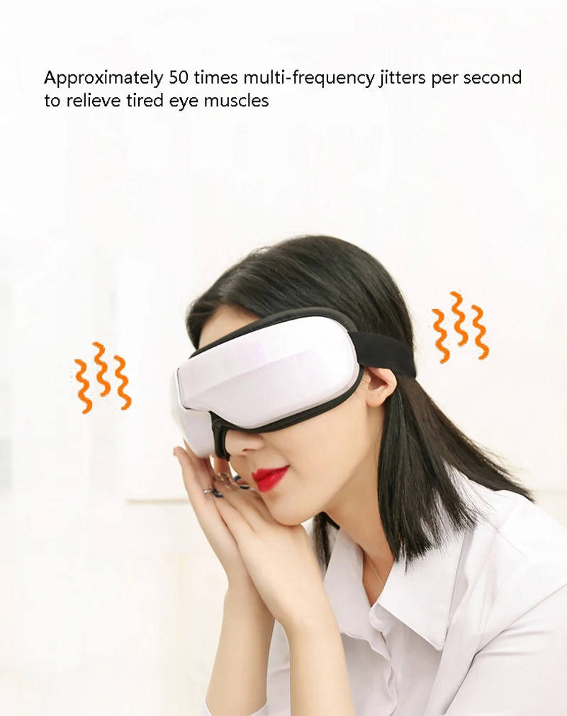 Принцип действия: в медицинской книге записано много точек акупунктуры вокруг глаз человека. Когда глаза часто протираются/мигают/близорукость/у них головокружение, глаза слишком устали, и кожу можно массировать вокруг глаз и висков должным образом. Достигайте эффекта дноуглубления и расслабляйте глаза. Массажер для глаз предназначен для имитации массажа «нажимайте-сжимайте-нажимайте» вокруг глаз и дужек, И добавьте горячий сжатие глаз, чтобы расслабить глаза и сотрудничать с музыкой Bluetooth, чтобы избавиться от усталости дня.