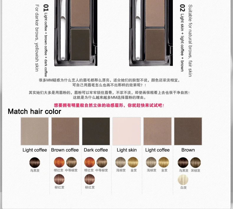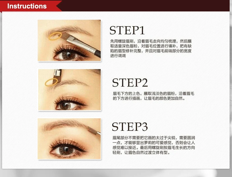 Эффекты: тонкая пудра, матовая, долговечная, три цвета 'комбинация для одного использования или использования в сочетании; Сделать бровь более трехмерным методом использования :( 1) возьмите небольшое количество этого продукта с помощью кисти, чтобы нарисовать форму бровей в направлении роста бровей; Три цвета от светильник до темного могут нарисовать более объемную форму бровей.(2) Влажное использование будет более клеевым и естественным.