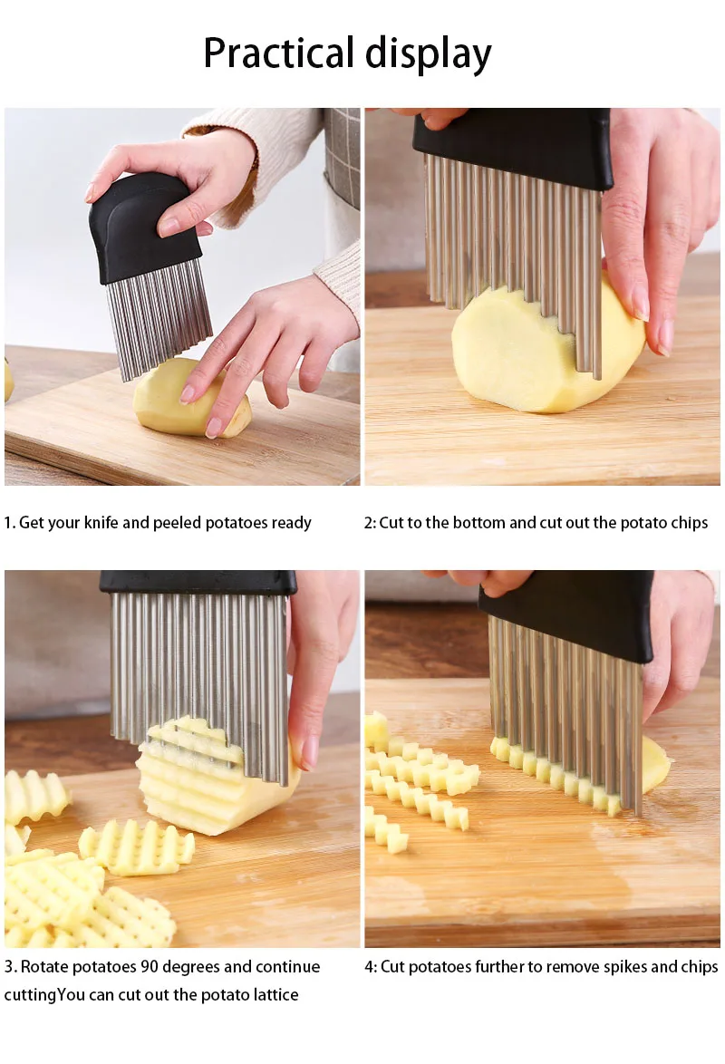 1: Recyclable and environmentally friendly.2: Strong and durable, used with sharp blades.3: The product does not contain harmful substances and is safe.4: Stainless steel, anti-rust.5: Easy to use, effortless vertical force slice.Note:1. Due to the different display and lighting effects, the actual color of the project may be slightly different from the color shown on the picture.2. Due to manual measurement, please allow 1-3cm measurement deviation.Package Included:1 x Potato Cutter(Cutter only, any other accessories not included)Product type: French Fry Cutters