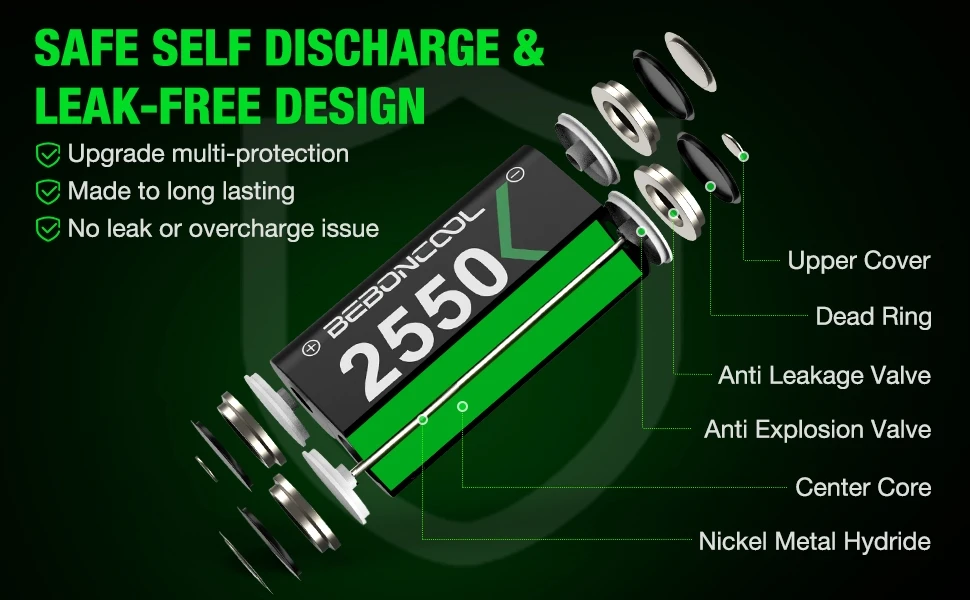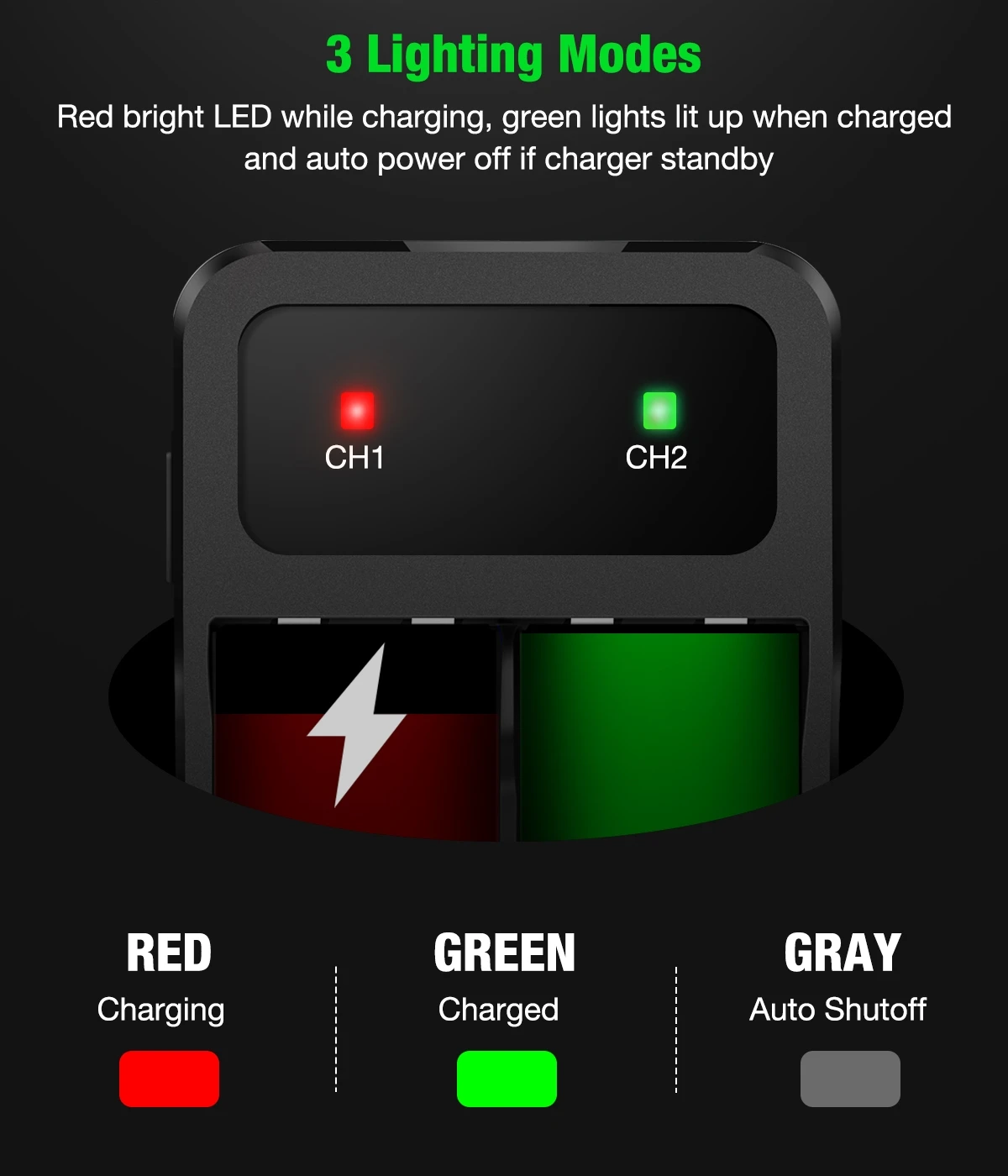 4. Четкий светодиодный индикатор зарядки: умное зарядное светодиодный Ной подзарядкой, когда аккумулятор заряжается более 5 часов, индикатор зарядного устройства загорится зеленым, аккумулятор заряжен не полностью, он останется красным, если в зарядном устройстве нет аккумулятора, Два светодисветодиодный да каждого зарядного устройства автоматически отключаются.
