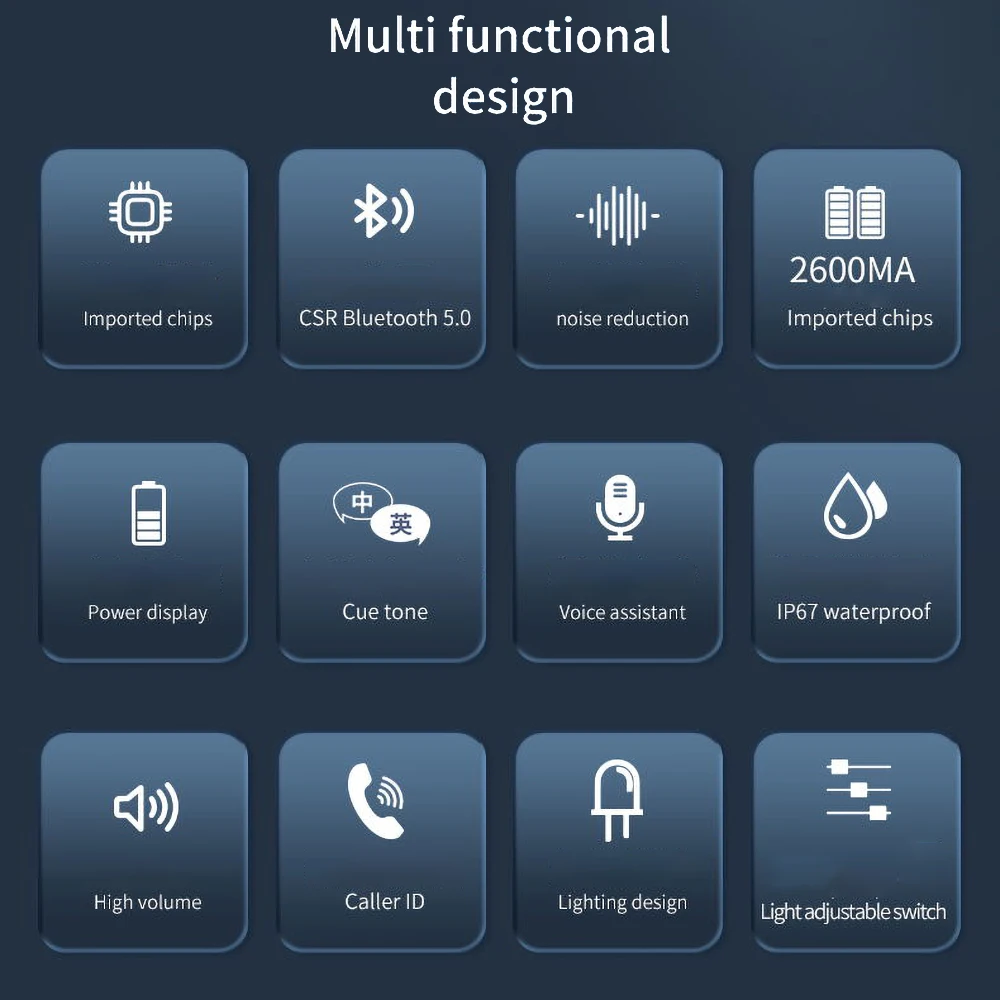 1.Fashion design, let music surrounding your life any time.2.handsfree function, turly free your hand.3.set-in rechargeable Li-ion battery, long stand-by and working time. support power displaying on iphone, easy to know when will to be charged.4.New waterproof structure design,supports the Siri intelligent voice control function of the IOS 4.0 and above, and suports android intelligent voice control function, convenient, quick and intelligent.5.Using the latest Bluetooth 5.0+EDR Bluetooth technology, superior signal transmission, ultra-low power consumption, all Bluetooth devices, automatic answering function, switchable manual answering phone function, safe and fast, built-in high quality anti-interference microphone It can effectively realize hands-free answering and hang up calls. High fidelity sound , support last song or next song function, volume addition and subtraction, playback pause, automatic callback and other functions, easy to operate. SpecificationsBluetooth Version:V5.0+EDRFrequency:2.40GHz-2.480GHzRange:20-30 meters(depending on device)Transmission distance of microphone: no more than 1 meter.Li-ion battery: 3.7v/2600mAhPlayback time: no more than 160hoursCharging voltage: 5VStandby time : 500hours. Notice:1.the device will need to be fully chargeed prior to inital use( about 2 hours) when you receive it.2.when charging,the red light will on and will off when full charging.3.the device can not be music playing and call answing while it is charging.
