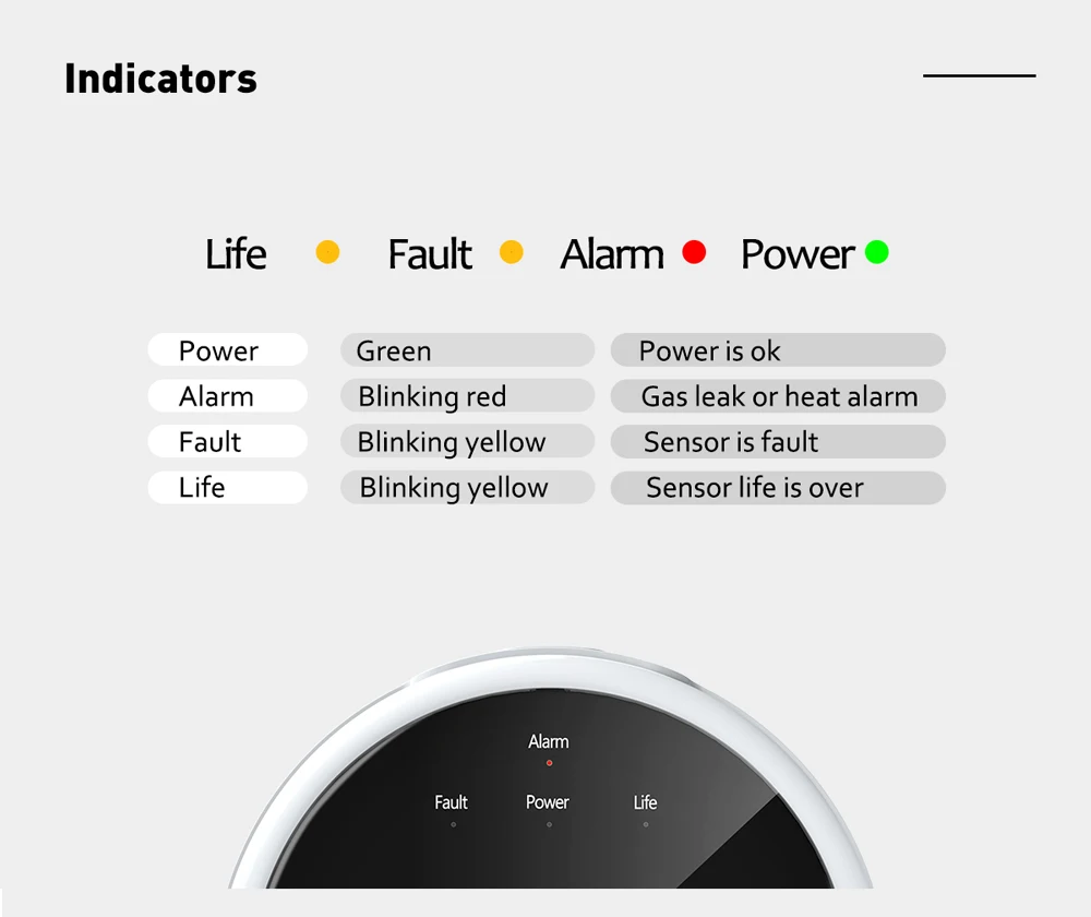 Звуковая и световая сигнализация, высокая децибелевая сигнализация, высокая чувствительность, супер долгий срок службы