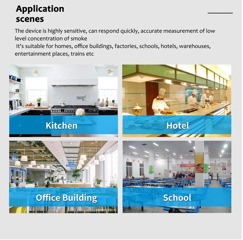 1. Устройство очень чувствительное, может быстро ответить, точное измерение низкого уровня концентрации дыма. 2. Подходит для домов, офисных зданий, фабрик, школ, гостиниц, складских развлекательных мест, поездов и т. Д.