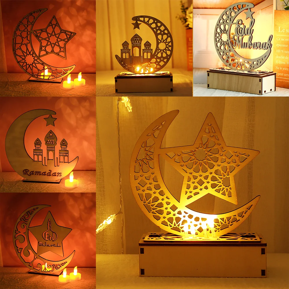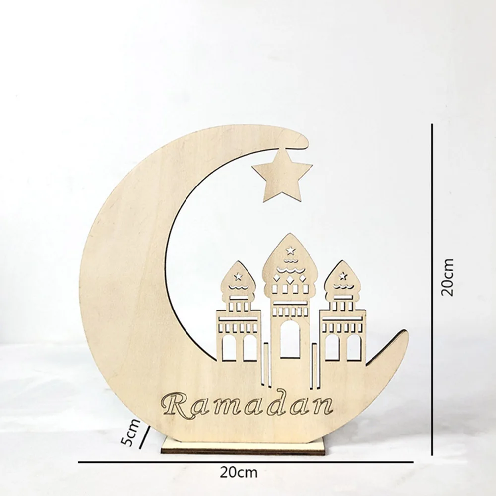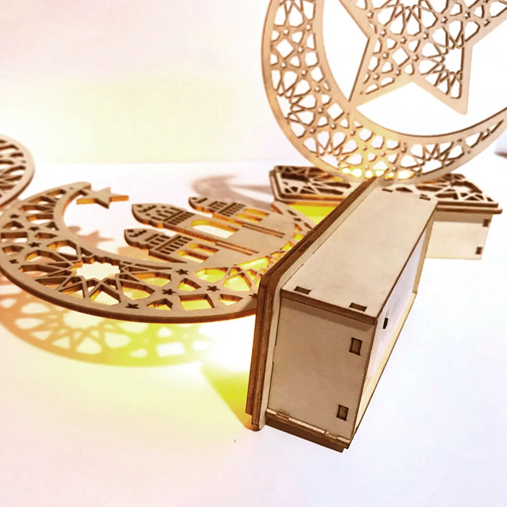 Eid Wooden LED Moon Light Eid Mubarak Ramadan Wood Crafts Warm White Lamp Battery Powered Ornament Muslim Islam Festival Indoor Home Party Desktop Table Decoration