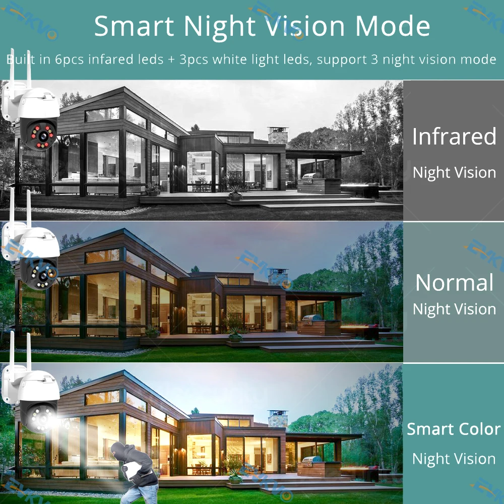Встроенный 4 шт. IR светодиодный + 4 шт. белый светильник светодиодный, 30MT ночное видение, 3 режима ночного видения на выбор в приложении, открытый Интеллектуальный двойной светильник, Режим цветного ночного видения сейчас! Обновите изображение ночного видения и низкий светильник, смотрите четкие детали даже на задний светильник и ночью.