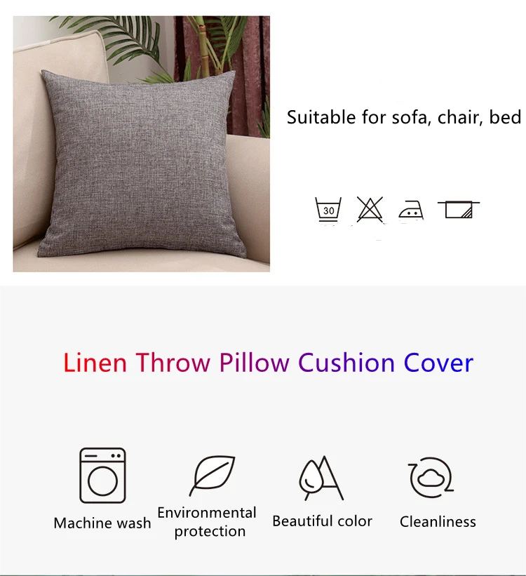 Материал: хлопок и лен Размер: приблизительно (40x40;45x45;50x50 см) (пожалуйста, учитывайте отклонение в 1-2 см) Застежка: скрытая молния Посылка включает в себя: 1 шт. наволочки (внутренняя часть подушки не входит в комплект) Примечание: 1. Две стороны одного и того же материала 2. Инструкции по уходу: Машинная стирка, теплая 30 °C. Не отбеливать. Не сушить в стиральной машине. Железо на обратной стороне, средняя температура. Не подвергать химической чистке.