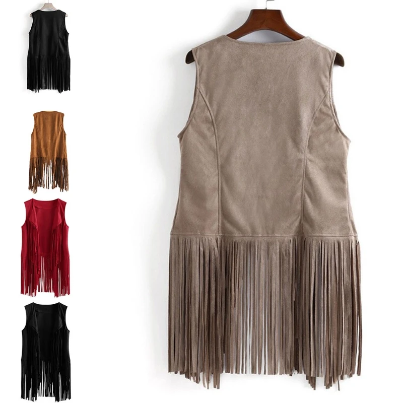Женская куртка без рукавов из искусственной замши в этническом стиле с длинной бахромой и кисточками, 70s хиппи, открытый Спереди Кардиган, винтажный ковбойский жилет, жилет, верхняя одежда, топы