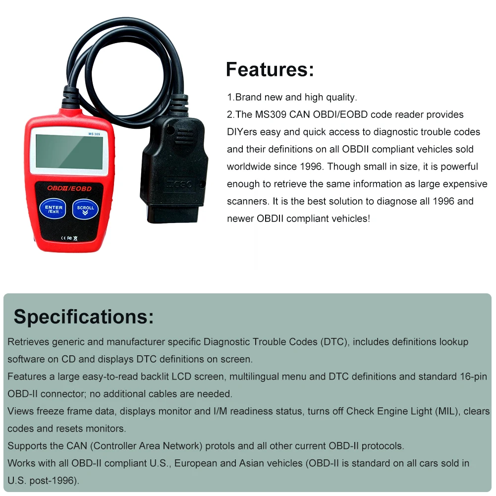 Считыватель кодов MaxiScan MS309 CAN OBDII/EOBD обеспечивает диагностические коды неисправностей и их определения на всех транспортных средствах, совместимых с OBDII, которые продаются по всему миру с 1996 года. Хотя он небольшой по размеру, он достаточно мощный, чтобы получить ту же информацию, что и большие дорогие сканеры. Это лучшее решение для диагностики всех автомобилей, совместимых с OBDII 1996 года и новее!