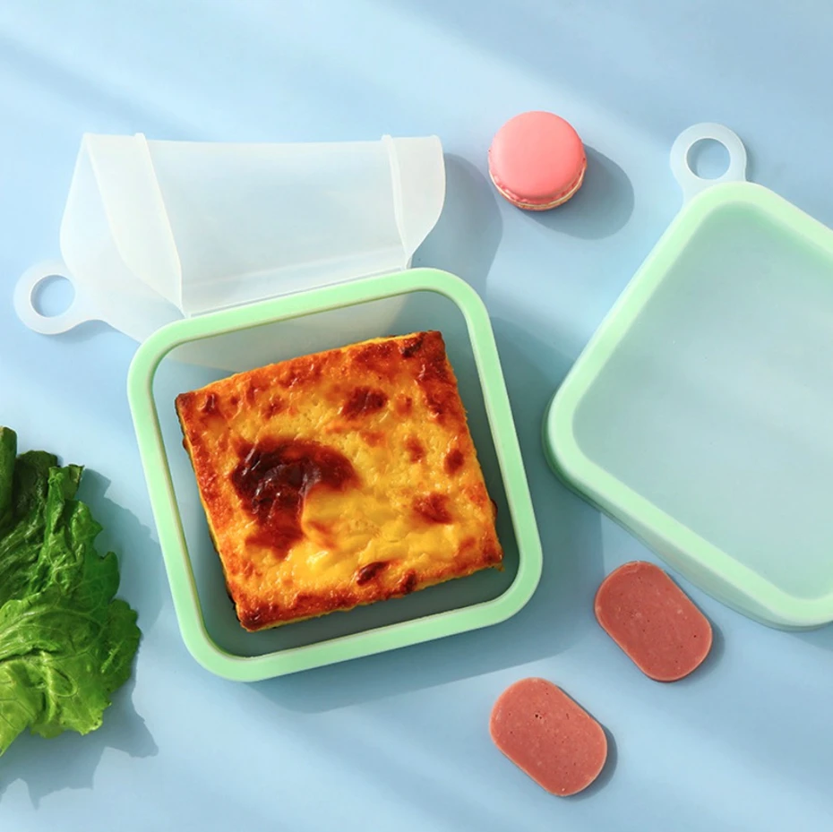 Light Weight and Suitable Size: The silicone bento boxes for sandwiches are soft, lightweight, ultra-thin, and portable. The size of the snack container is just suitable for sandwiches toast. Easy to put in a handbag. Dishwasher and Microwave Safe: food-grade silicone is safe for use in the freezer, microwave, dishwasher, boiling water, and oven up to 350/F. Please take off the PP frame for fixing before put it into the microwave. Wide Application: The sandwiches toast box is great for students, teens, office workers to carry their lunch. Also can be used for picnics, keeping baby snacks, food storage, etc.