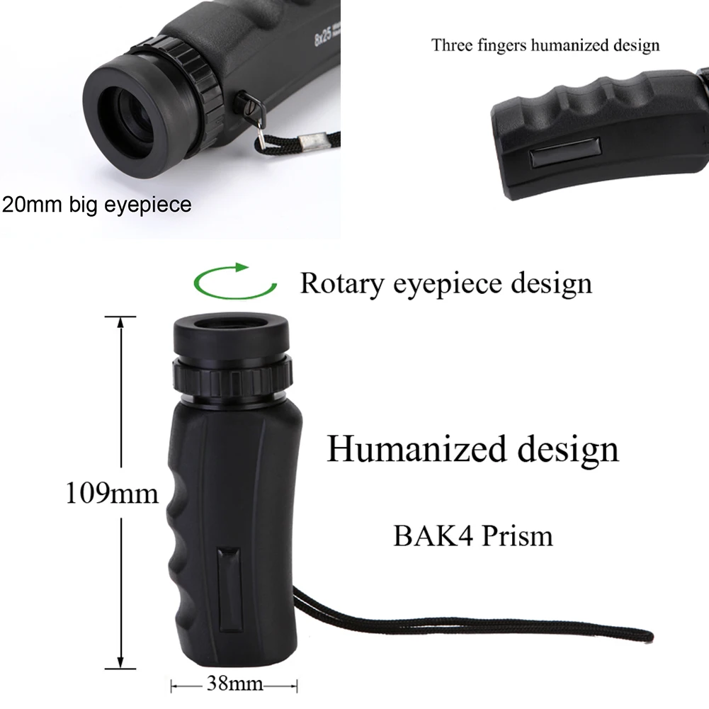 * 1. Этот Монокуляр обеспечивает 8-кратное увеличение и диаметр объектива 25 мм.