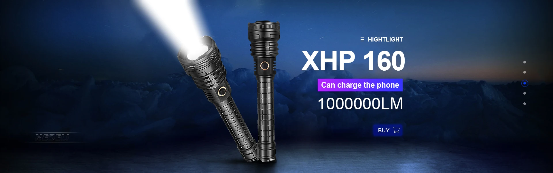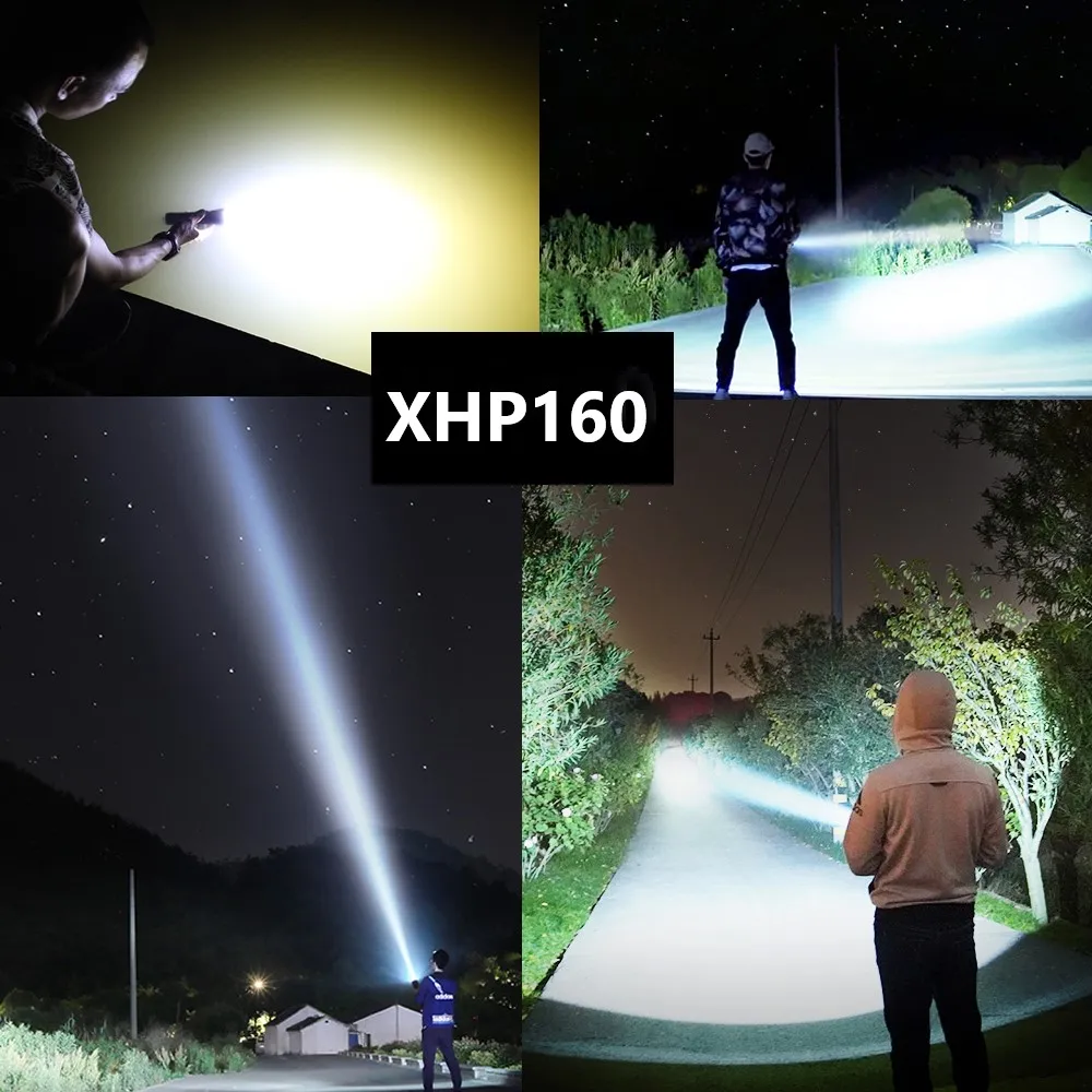 XHP160 использует 2*18650 батареи или 2*26650 батареи для длительного освещения часов. Водонепроницаемый, предотвращает брызги под разными углами, подходит для наружной среды и плохих погодных условий.