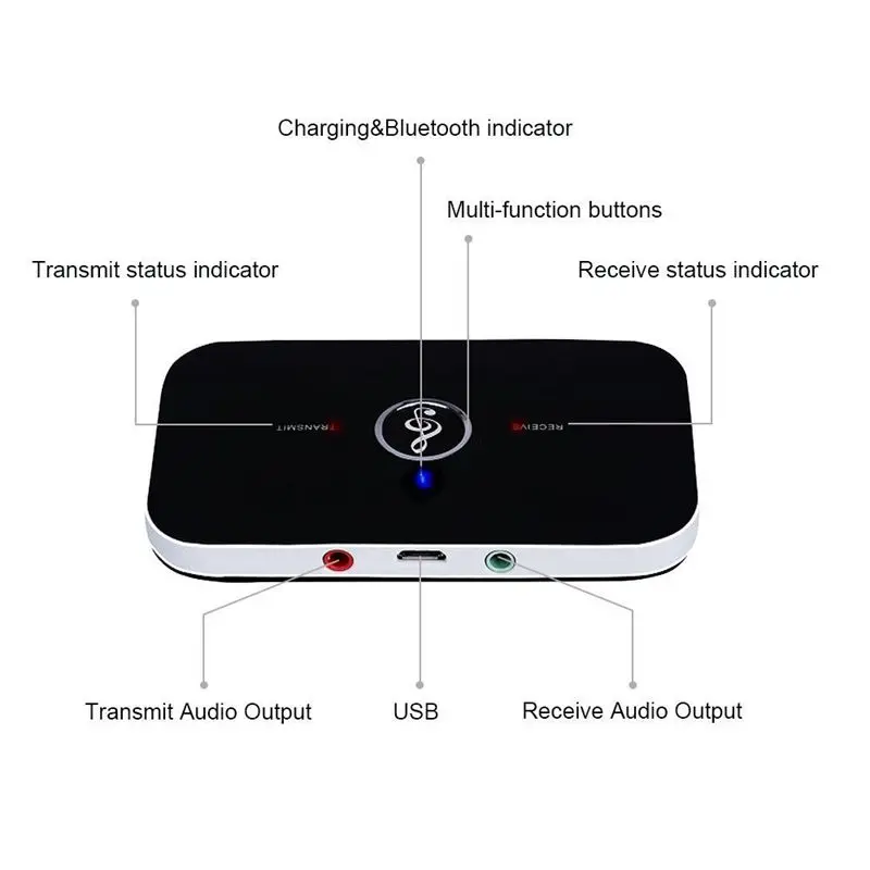 Режим передатчика: Подключите аудиоустройства (например, MP3, MP4, TV и PC и т. д.) через аудиокабель или RCA. Функция bluetooth-передатчика по беспроводной сети передает аудио в bluetooth-колонки или наушники с вашего телевизора или более старых мультимедийных устройств, таких как портативные CD-плееры, которые не имеют встроенного Bluetooth.