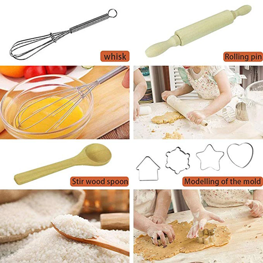 Посылка включает в себя-В комплект входит 1 * шляпа шеф-повара, 1 * фартук, 1 * Скалка, 1 * рукавица, 1 * термостойкий Коврик, 1 * деревянная ложка, 1 * ручной миксер, 5 * Пластиковая форма для печенья. Всего 15 штук. Подходит для приготовления пищи и выпечки маленького шеф-повара.