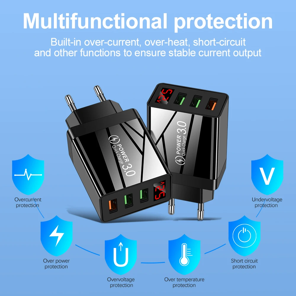 QC3.0 USB Charger Adapter LED Display For Samsung S20S9 iPhone 12pro max 11 X Xiaomi Tablet EU US Plug Wall Mobile Phone Charger