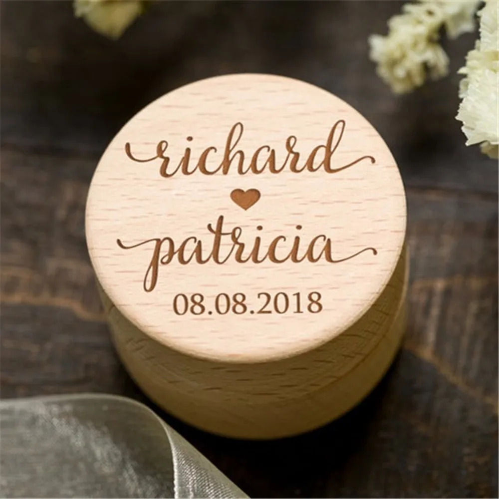 Деревянная шкатулка для свадебных колец в деревенском стиле с гравировкой имени и даты на заказ, держатель для колец, Круглая Коробка для хранения, чехол