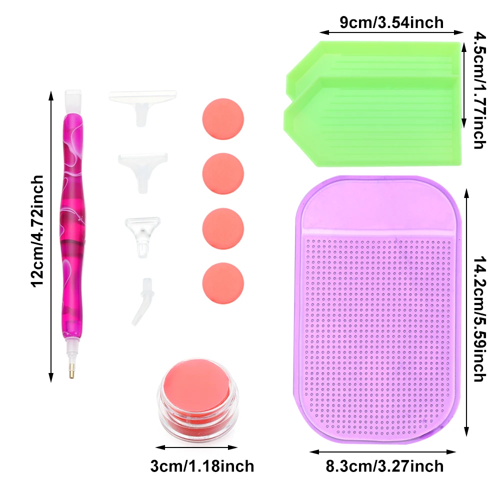 1. Что вы получите: наши наборы для алмазной живописи включают в себя 1 шт. корпус ручки для рисования, 4 шт. клеевая глина с 1 шт. бутылочкой для глины, 1 шт. лоток для дрели, 1 шт. ящик для хранения, 1 шт. насадка для дрели, 12 шт. сменные головки для дрели (3-14 головки, каждая головка для дрели имеет 1 шт.). Полный набор инструментов, достаточно для изготовления алмазной живописи, не нужно покупать другой
