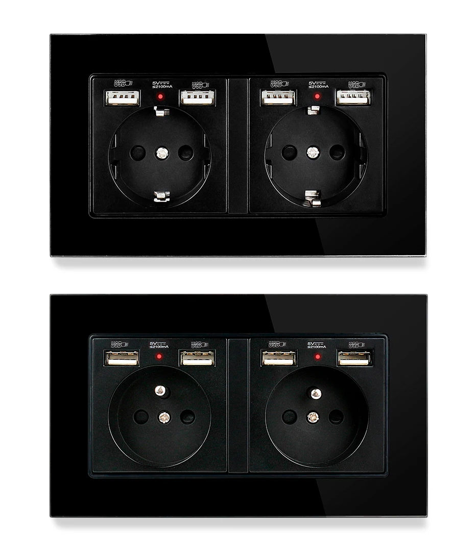 UNKAS EU French Socket Dual USB Port + TV RJ11 Telephone RJ45 Internet Computer Jack Black Tempered Crystal Glass Panel Outlet