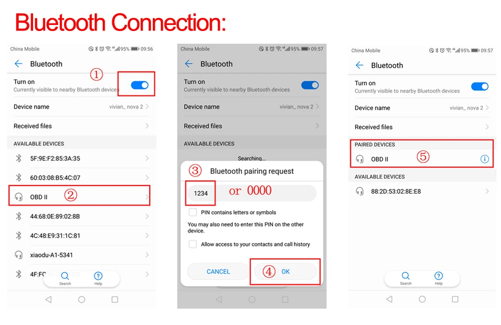 1) Откройте «Настройки» вашего android и найдите bluetooth «OBD II» от ELM327, затем введите пароль 1234
