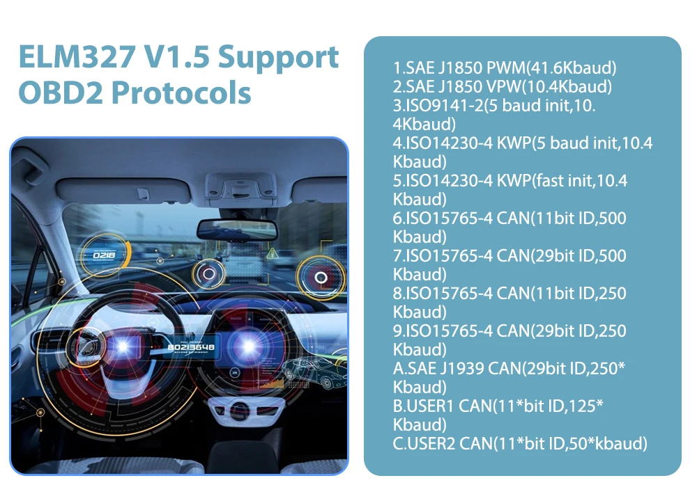 ELM327 V 1,5 поддерживает стандартные протоколы OBD2: