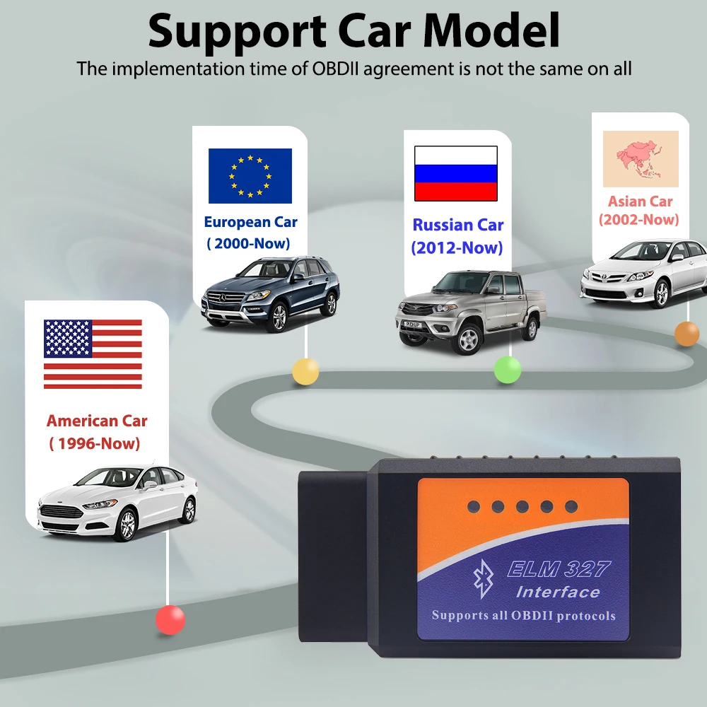 ● Американская автомобильная Поддержка автомобиля после 1998 года ● Европейская Автомобильная Поддержка автомобиля после 2000 года ● Азиатский автомобиль поддержки после 2002 года, (Япония и Корея и Китай и так далее) ● Поддержка российских автомобилей после 2012 года (ВАЗ/УАЗ/газ) ELM327 работает только с бензиновыми и дизельными автомобилями 12 В. Сначала проверьте модель автомобиля из списка.