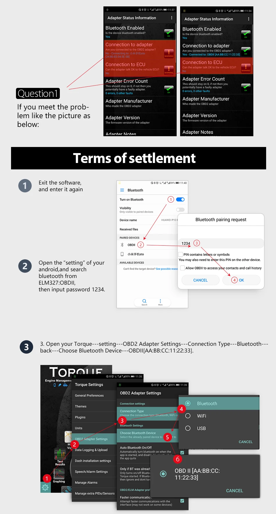 Решение: 1. Выйдите из программного обеспечения и введите его снова 2. Откройте «Настройки» вашего android и найдите bluetooth «OBD II» от ELM327, затем введите пароль 1234 3. Откройте крутящий момент-Настройка-настройки Адаптера obd2-Тип подключения-bluetooth-назад-Выберите bluetooth-устройство-obdii[AA:BB:CC:11:22:33]